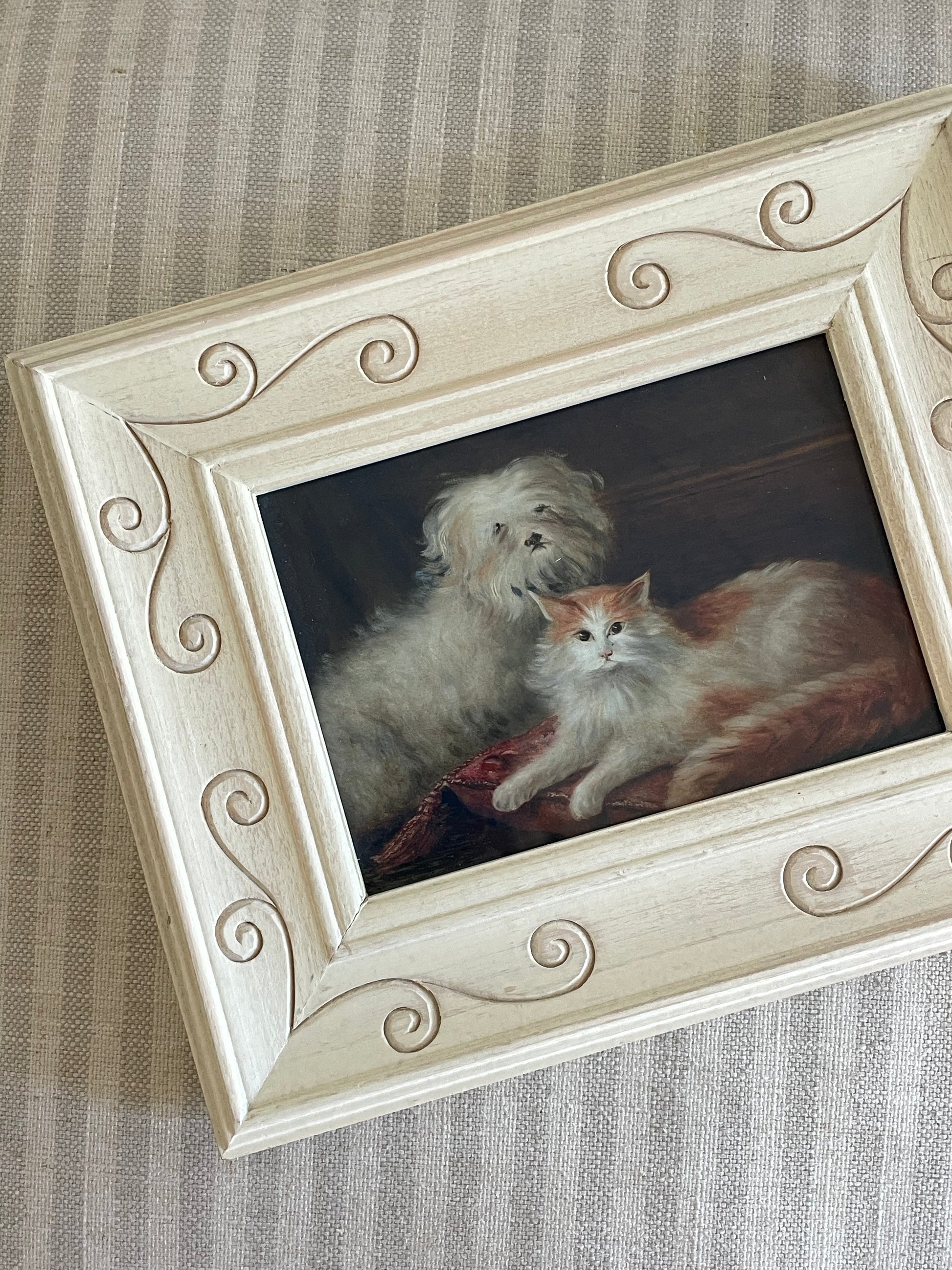Art print of the oil painting titled "Study of a Terrier and a Cat" by British artist Henry Maurice Page, completed in 1875. This beautiful 19th century pet portrait print is set in a beautiful vintage wooden frame.