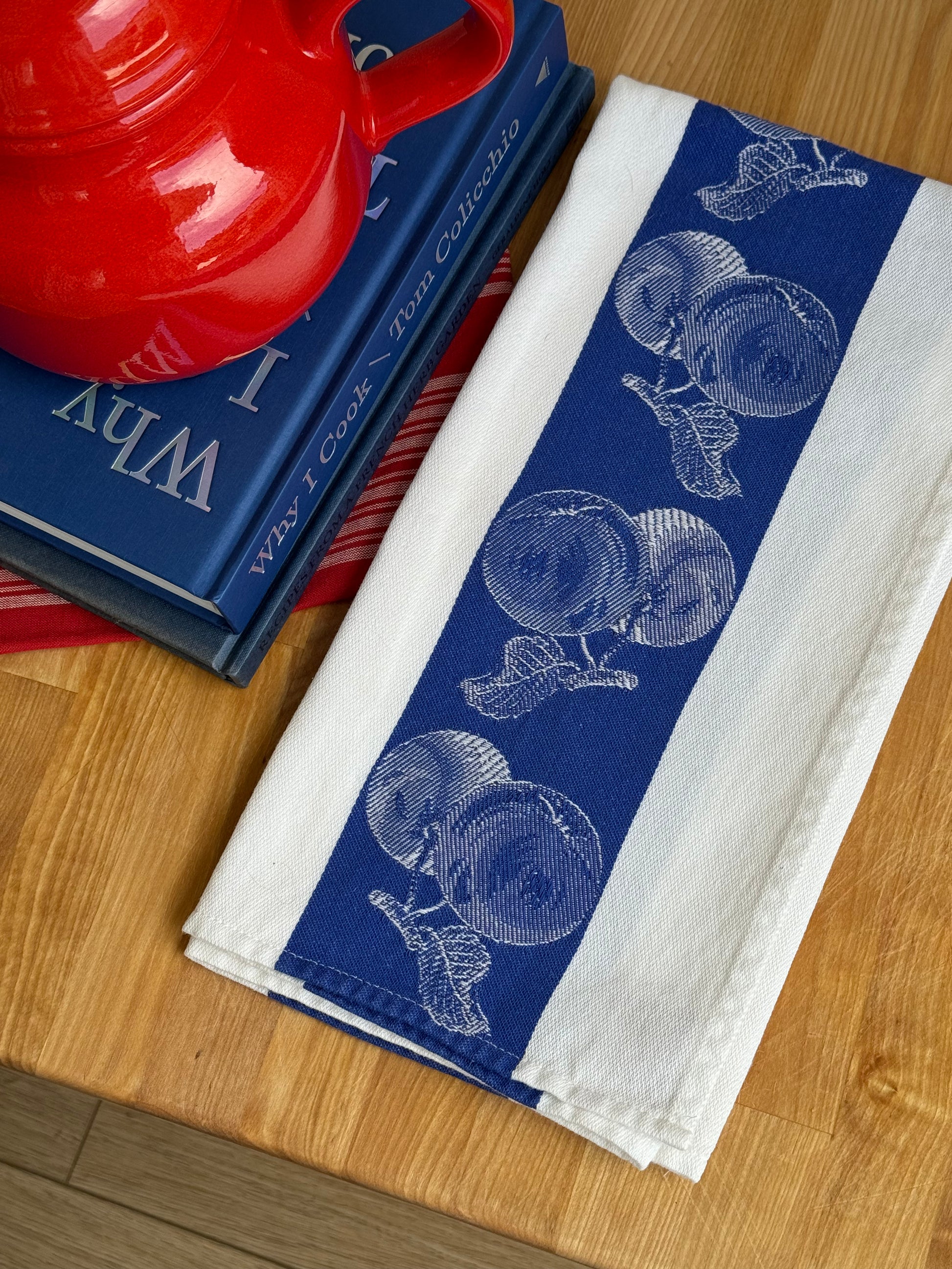 Vintage tea towel featuring a charming blueberry print. Soft, lightweight 100% cotton with a cheerful pattern that adds a pop of color to your kitchen. A sweet and simple touch for summer cooking and hosting! Brand: Garnier Thiebaut.
