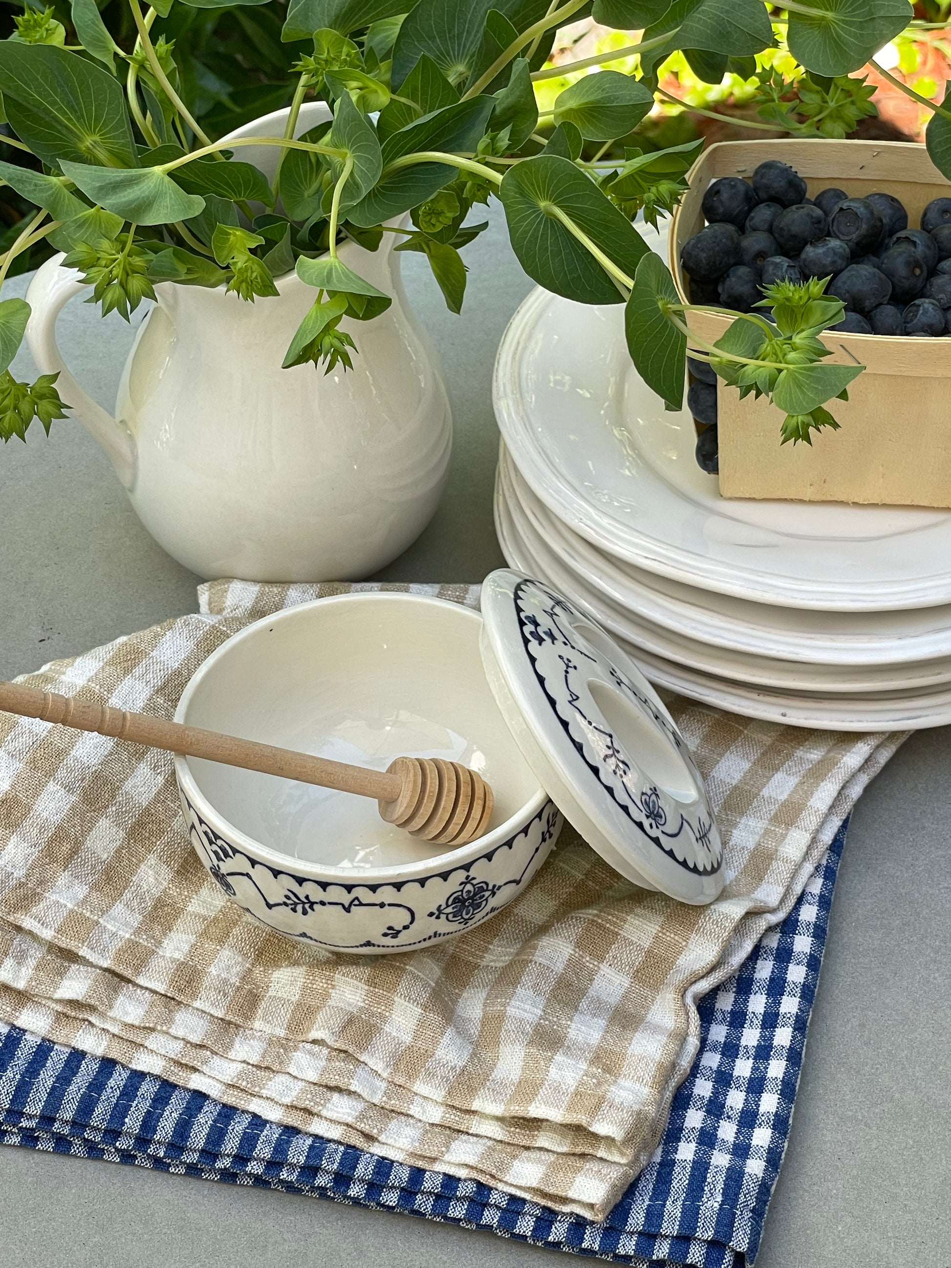 This charming blue and white ceramic jar is as cute as can be! Use it to serve honey or jam, or it can double as a salt cellar, sugar bowl, or butter dish—adding a whimsical touch to your table!