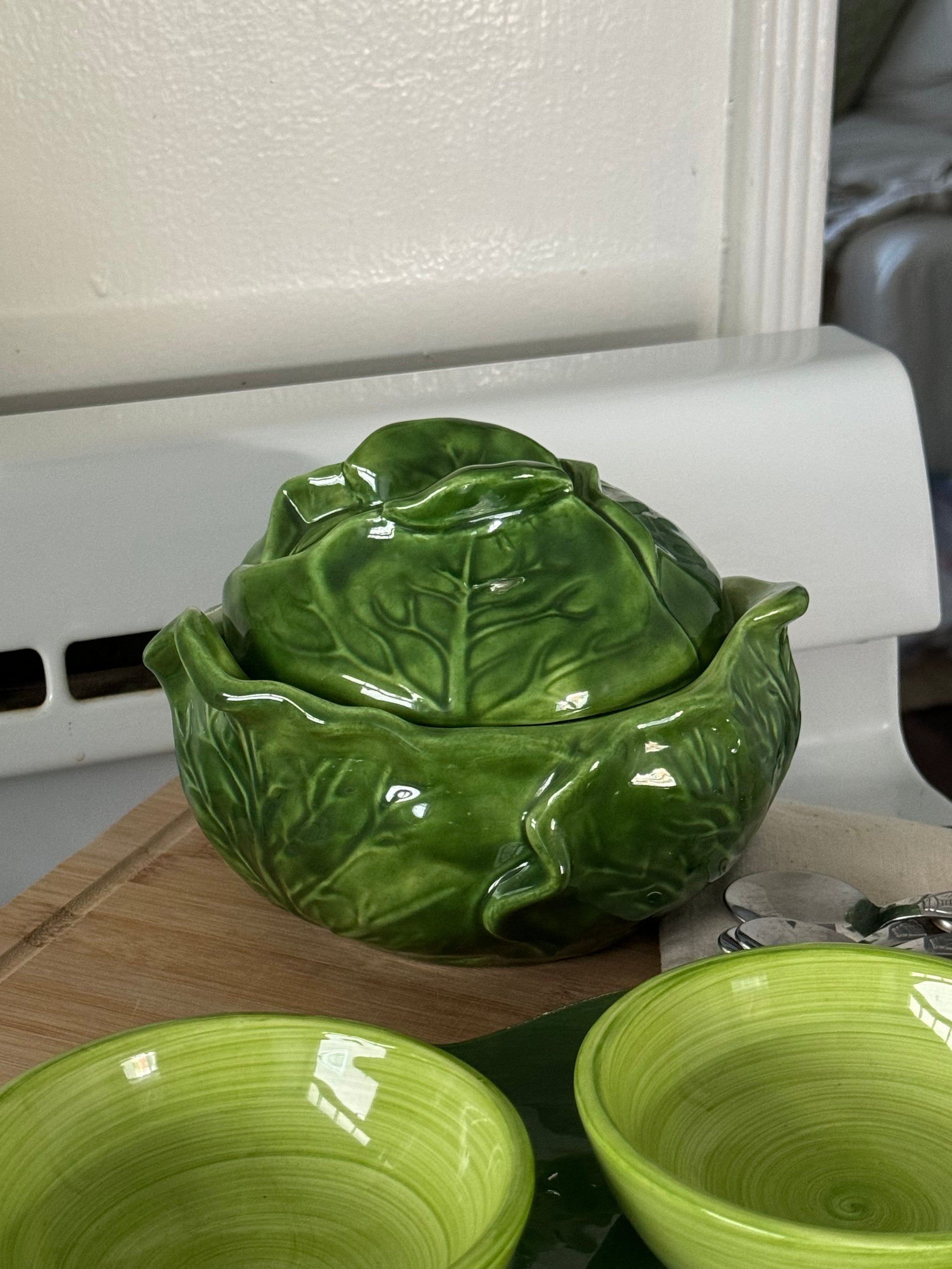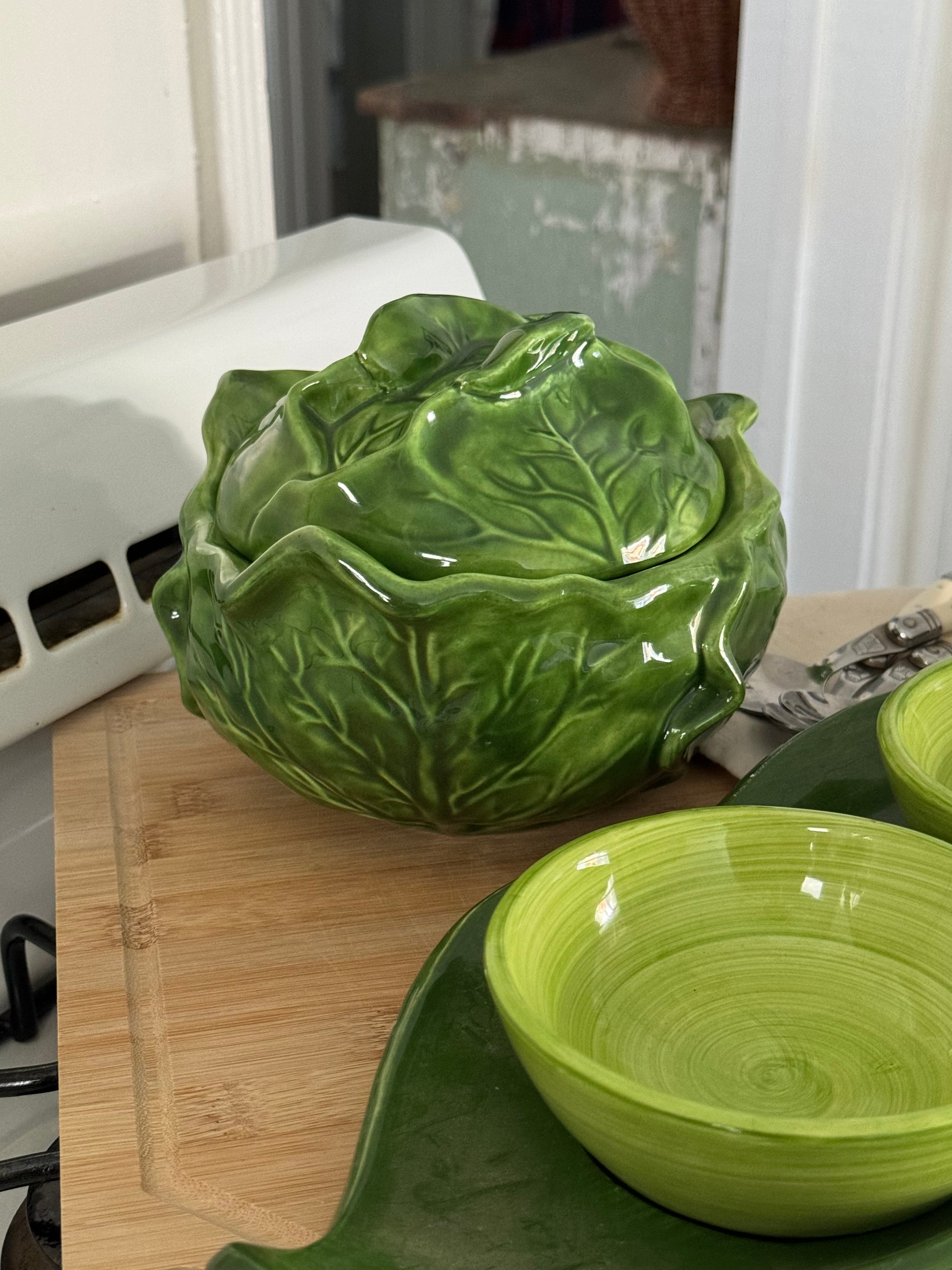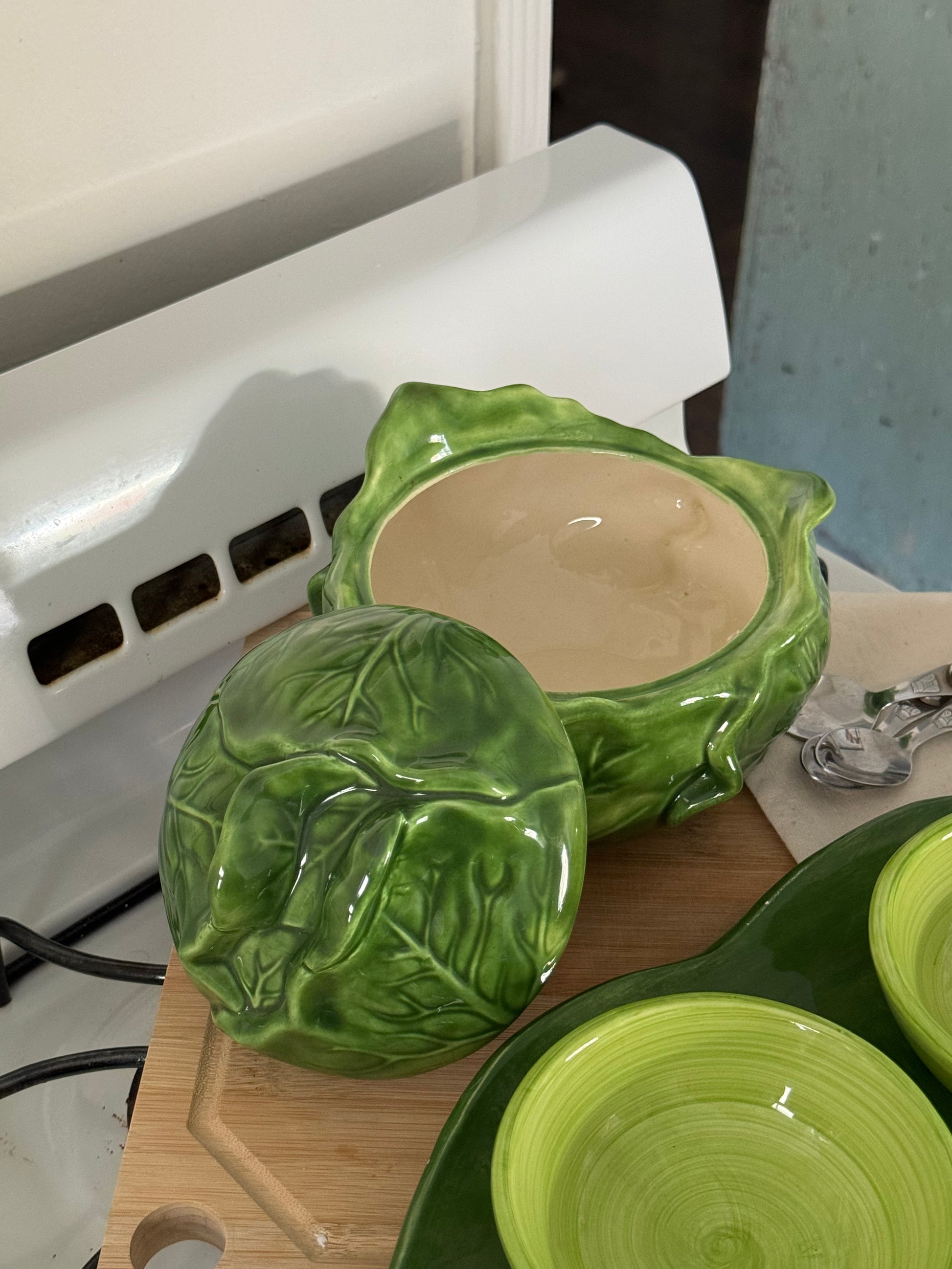 Get in your greens with the Cabbage Patch Jar! This vintage 'Holland Mold' Cabbage is here to add charm to your kitchen counter. It's a fun and functional addition to any home.