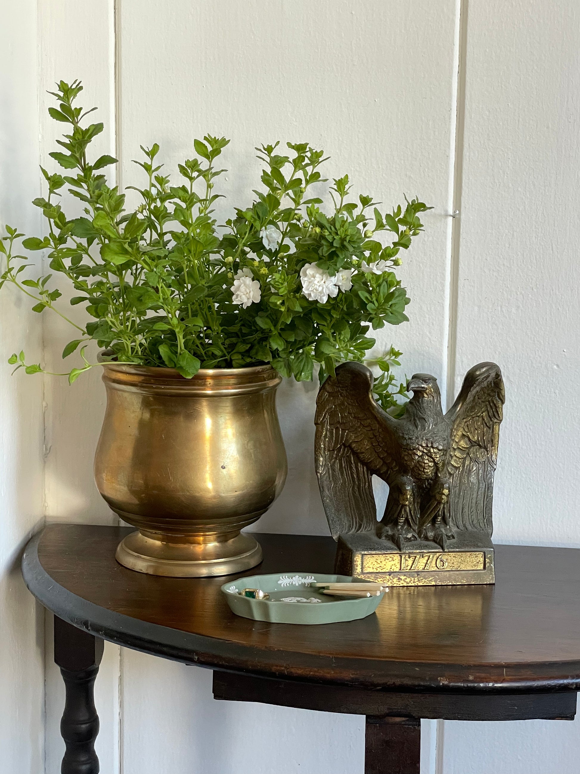 A timeless brass planter with a warm, golden patina that adds a touch of elegance to any space. Perfect for housing your favorite houseplant or as a decorative accent on a shelf or table.
