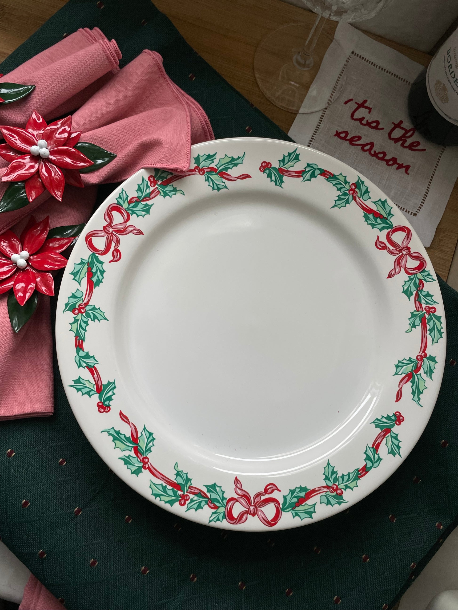 White ceramic dinner plates adorned with holly and ribbons around the rim! Perfect for adding holiday cheer to your tabletop!