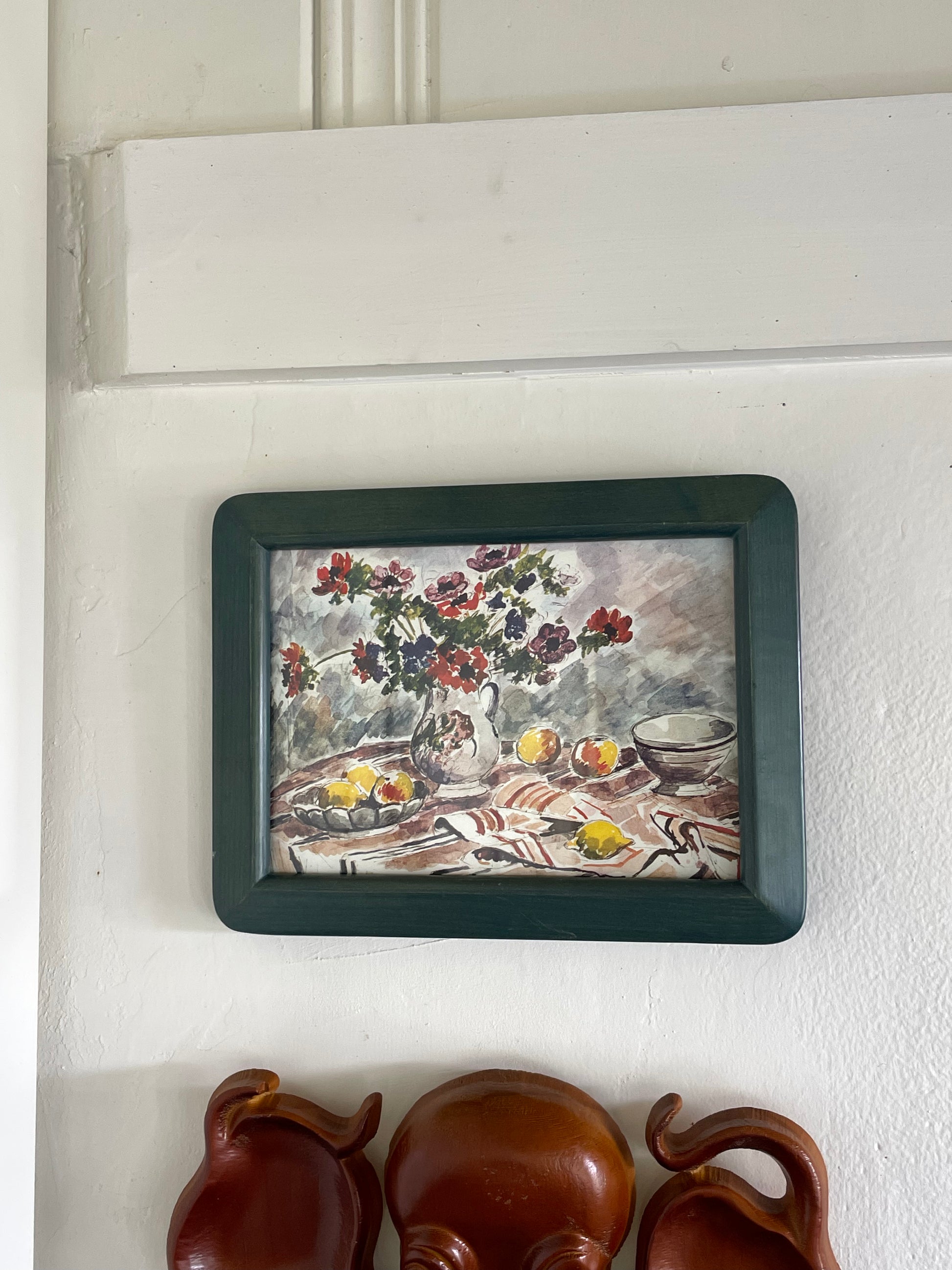 A quiet still life of flowers and lemons, framed in deep green wood that echoes the natural warmth and freshness of the art.
