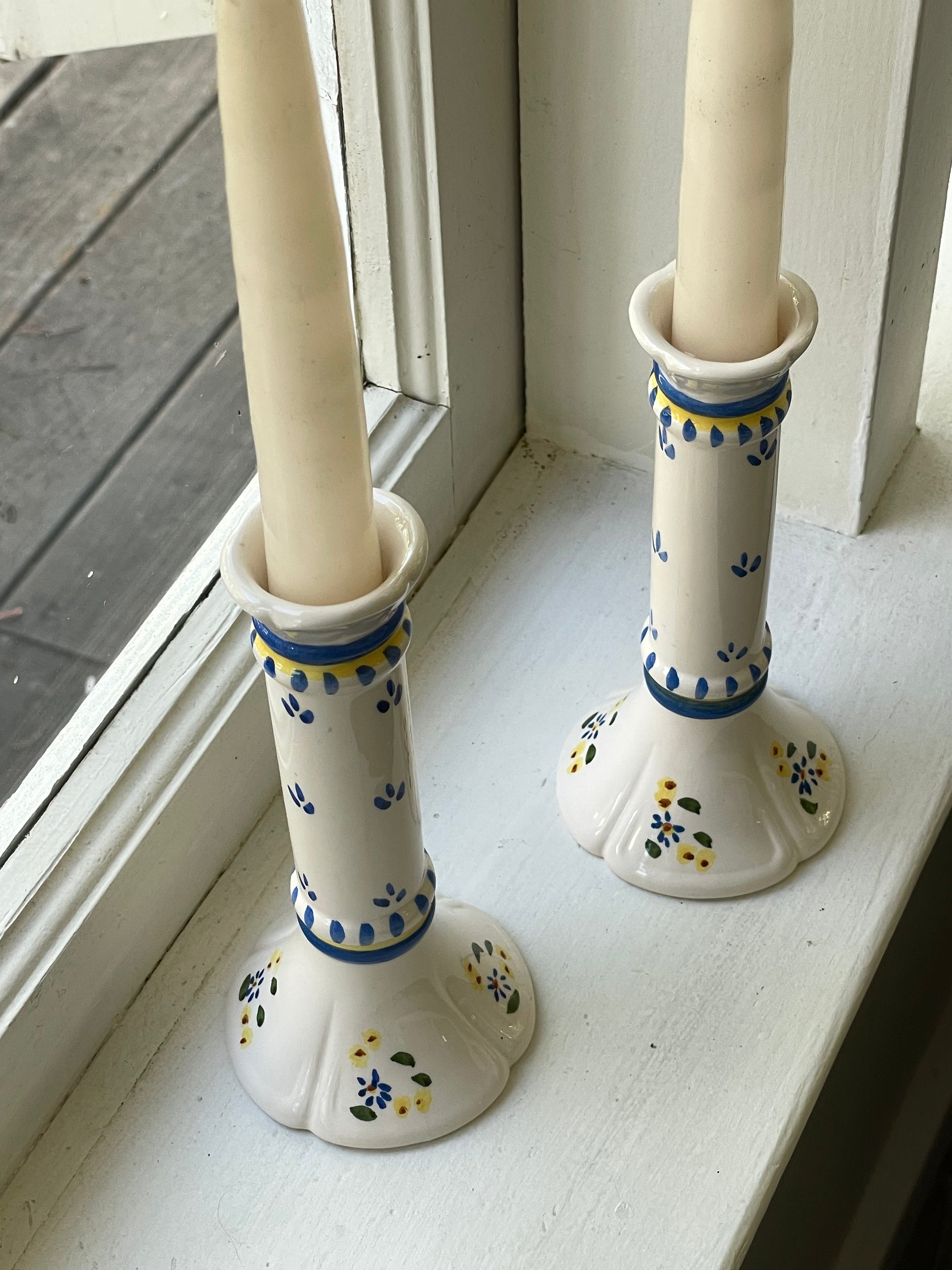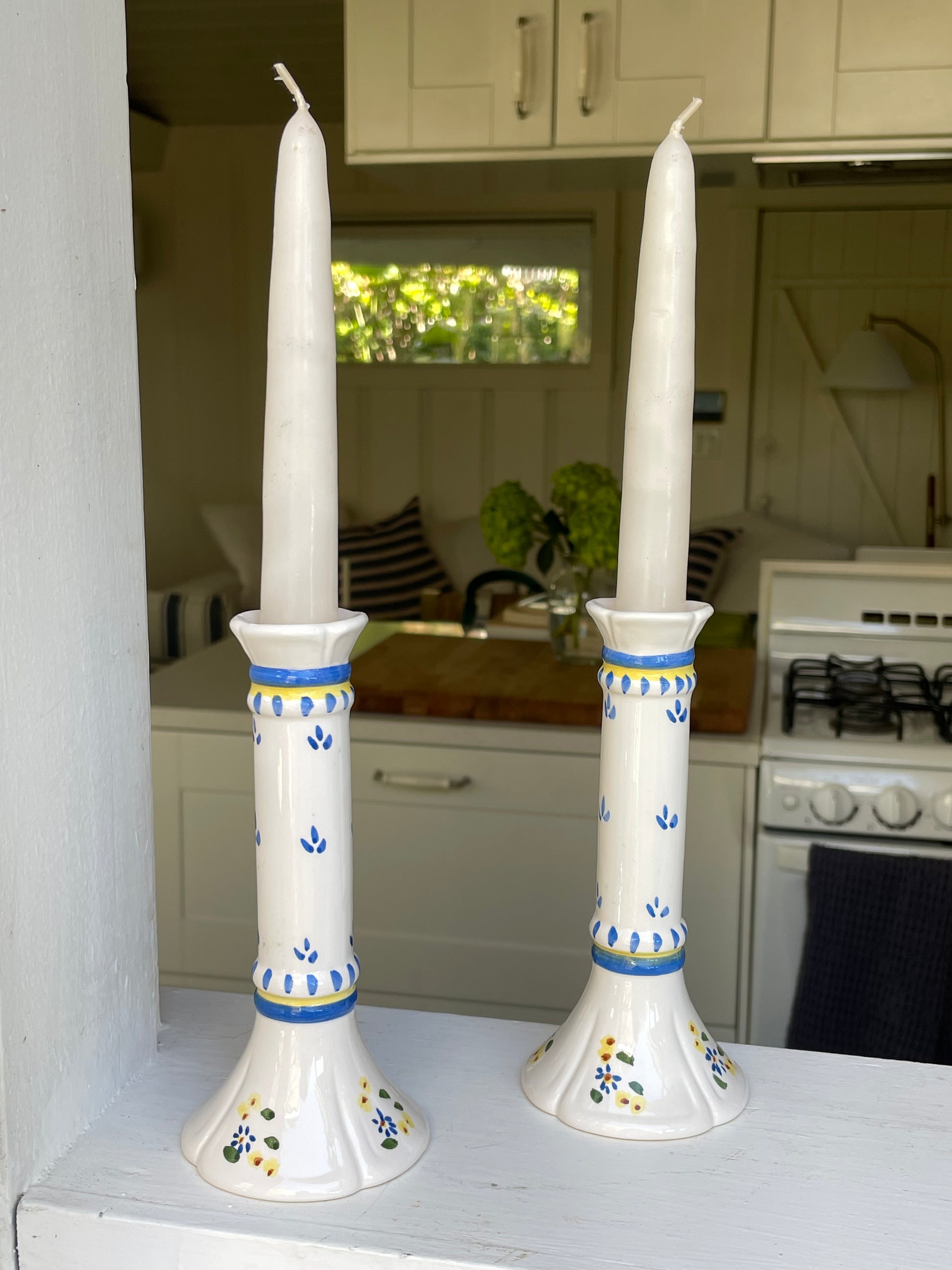 Beautiful white ceramic candlesticks decorated with blue and yellow painted lines and flowers. A cheerful, artistic pair by Potpourri Designs that instantly brightens any space.
