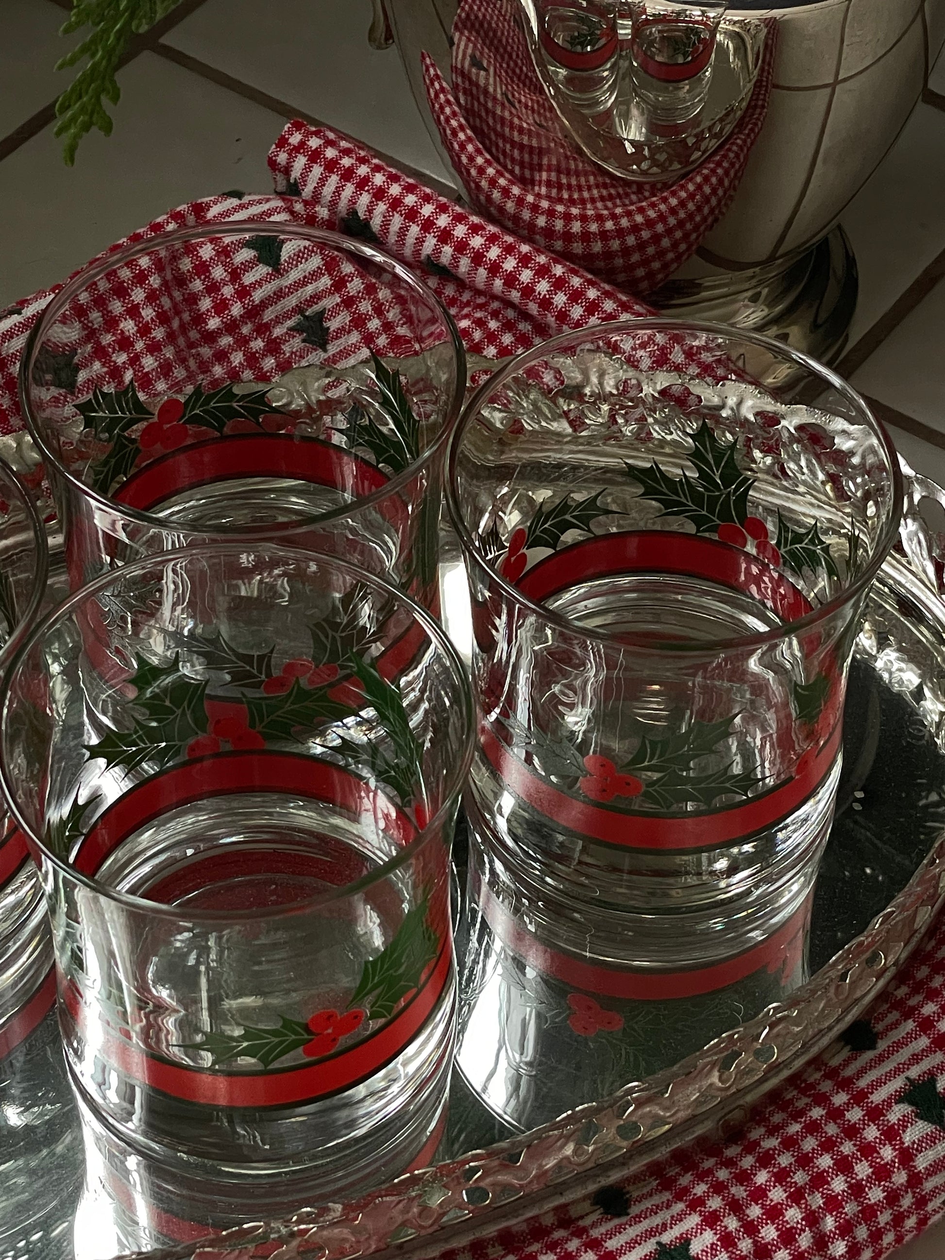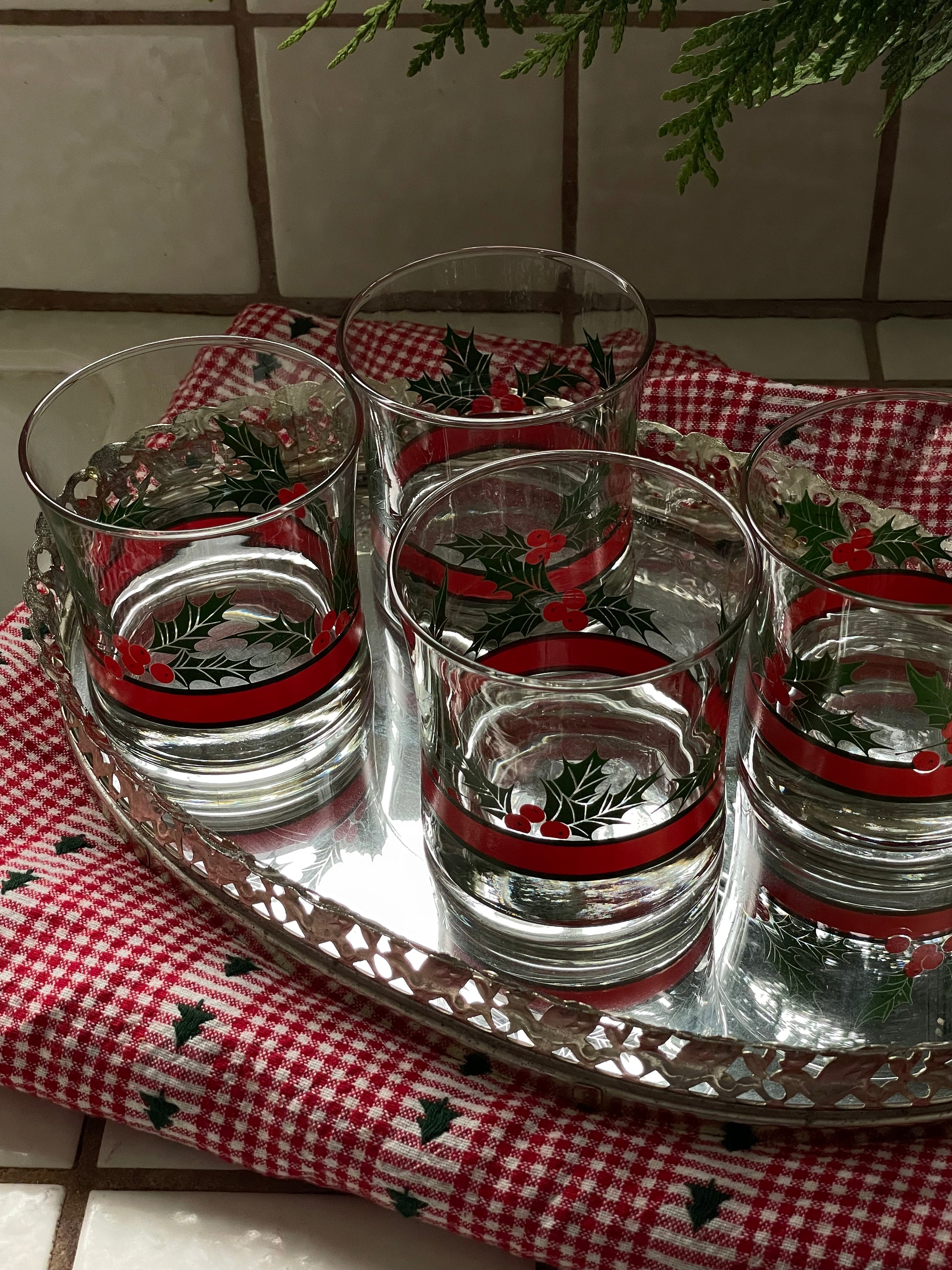 A set of 4 glasses adorned with holly and a green & red stripe. The perfect addition to your holiday tablescape!