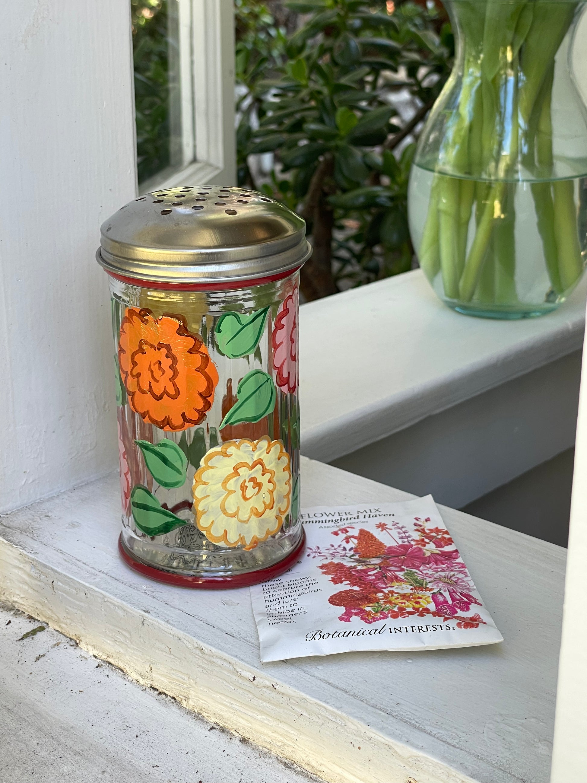 This charming hand-painted sugar shaker has been repurposed as a flower seed shaker. It comes with a packet of Hummingbird Haven flower mix, making it perfect for planting blooms that attract hummingbirds and brighten your garden. A whimsical, functional piece for garden lovers. Makes a great gift too!