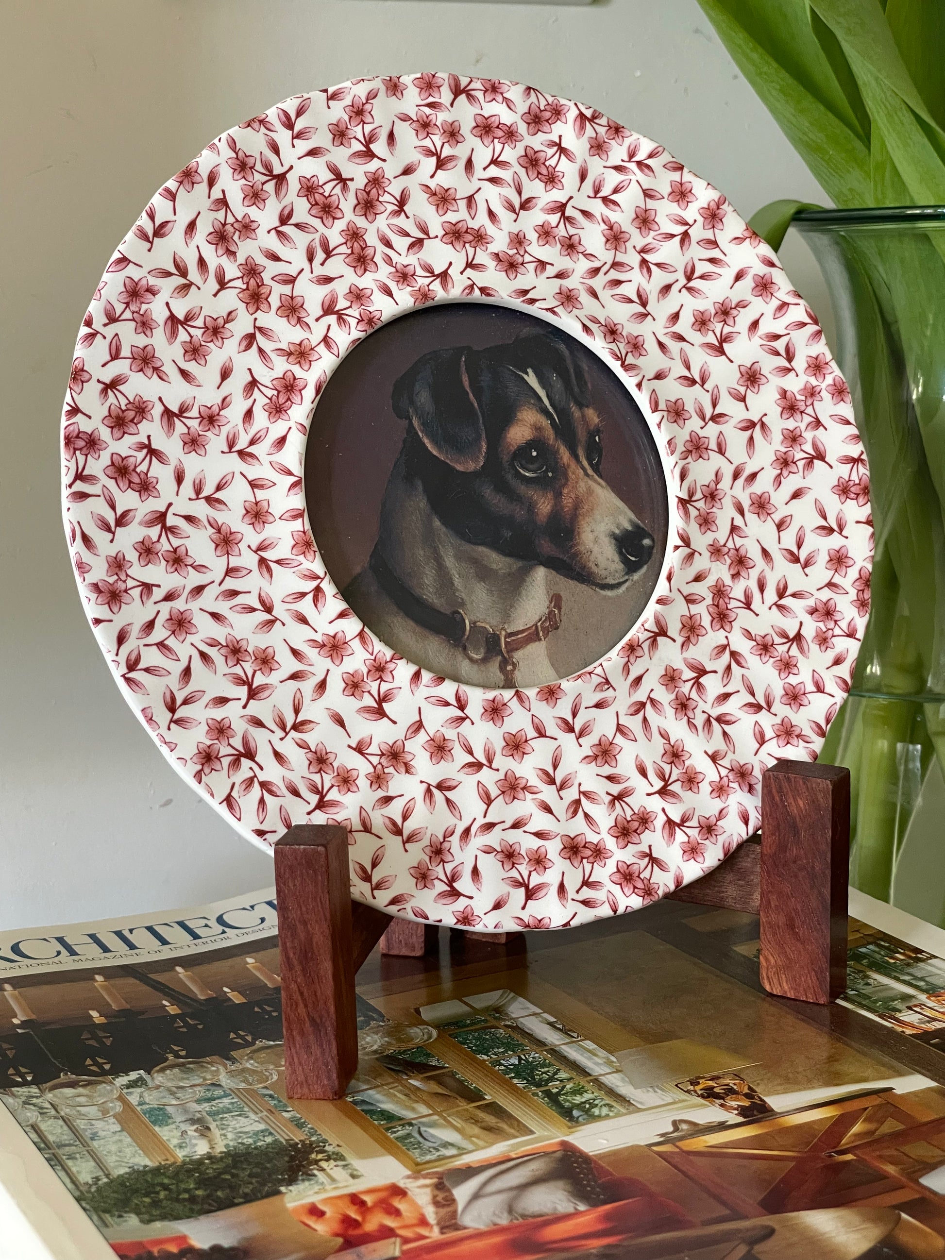 Portrait of a Jack Russel Terrier in red and white floral frame. Print of painting by Carl Reichert (Vienna, 1836-1918).