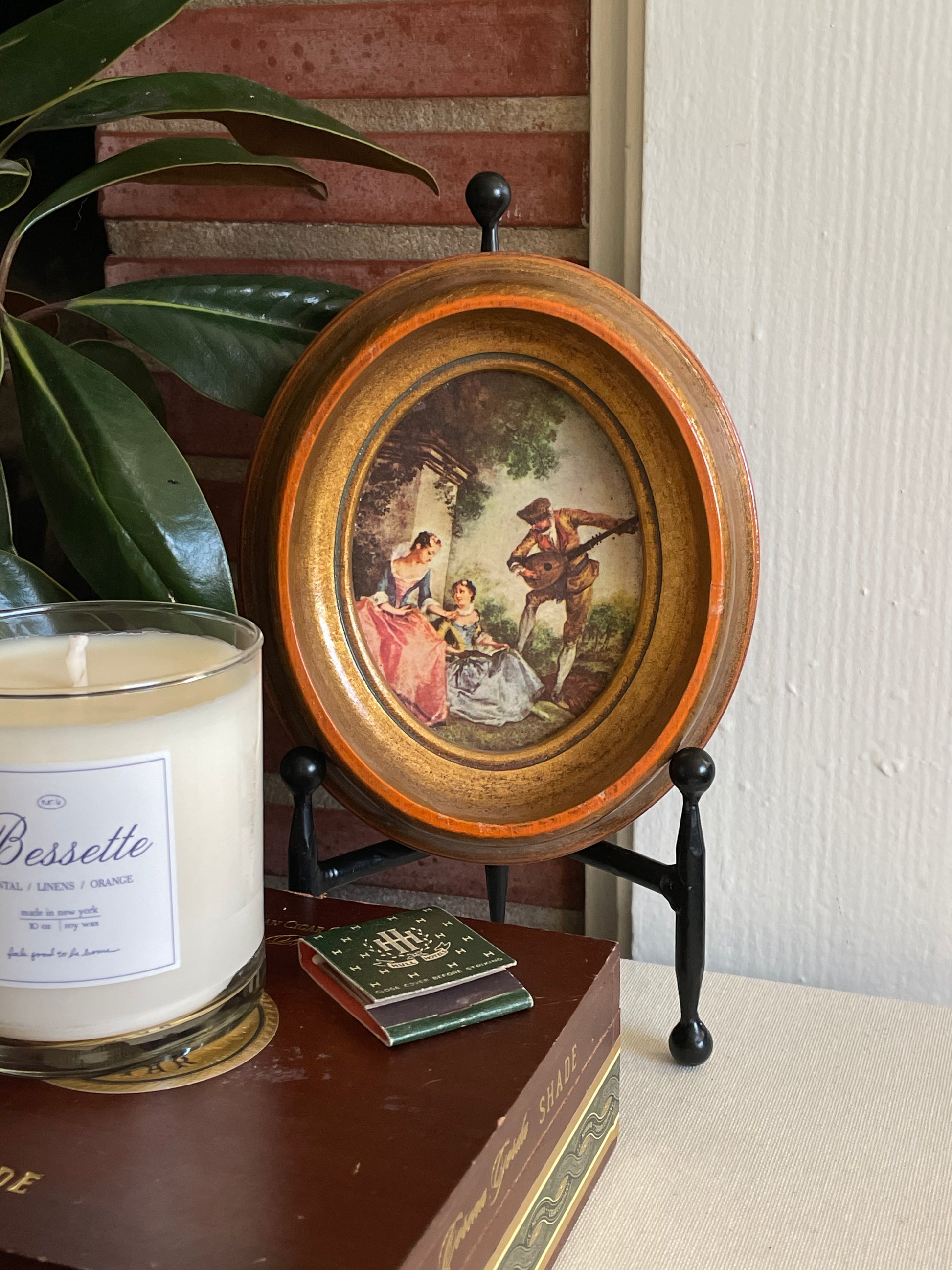 Beautiful framed art piece depicting a scene in 18th-century French Rococo style in a gorgeous vintage wooden frame.