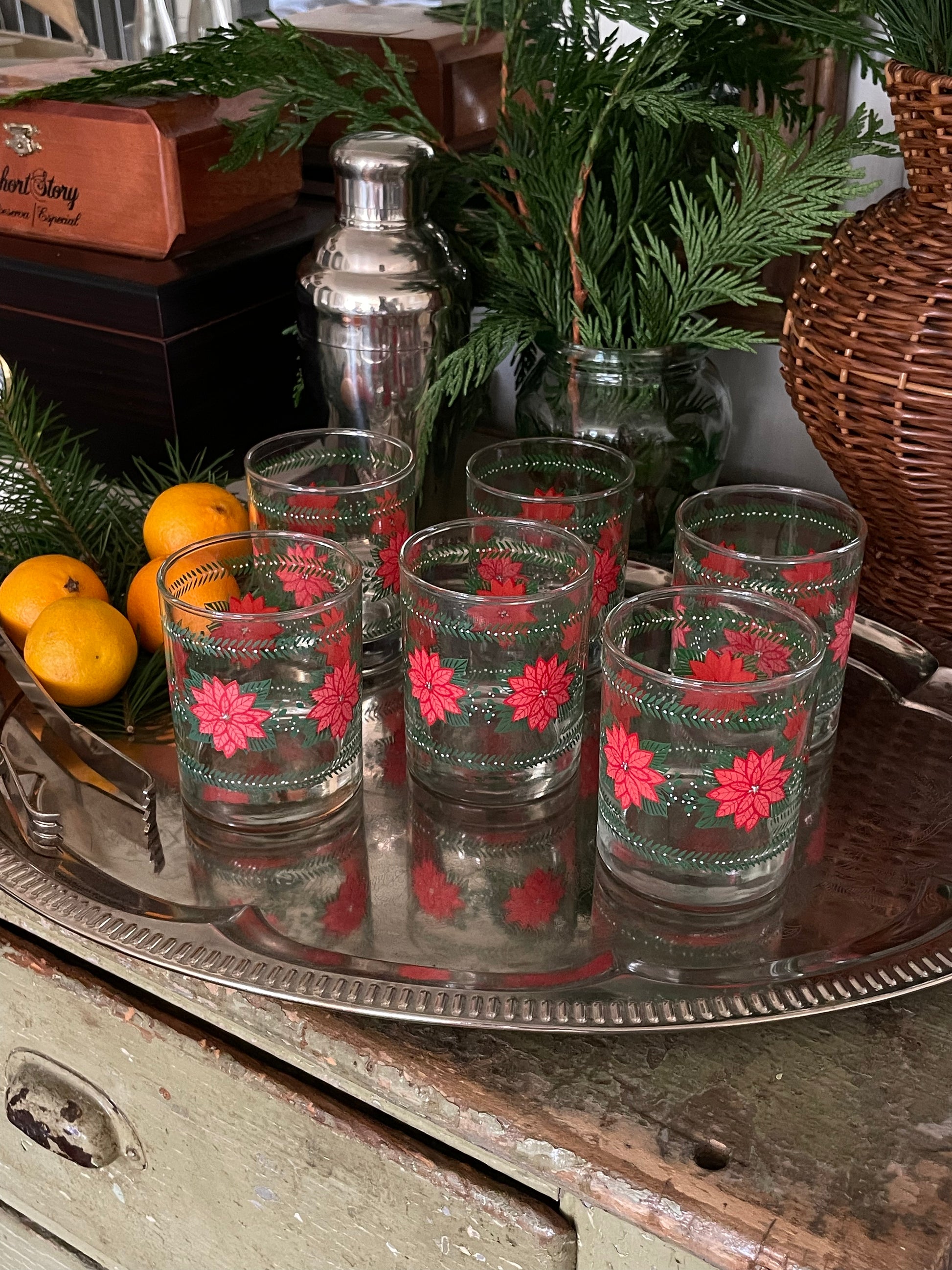 Celebrate the season with this charming set of 6, vintage 1975, Mayfair Glasses! Each glass features a festive Poinsettia design, perfect for serving cocktails, water, or seasonal drinks with a touch of vintage holiday cheer. These Lowball glasses are ideal for entertaining, gifting, or adding a whimsical accent to your holiday table.