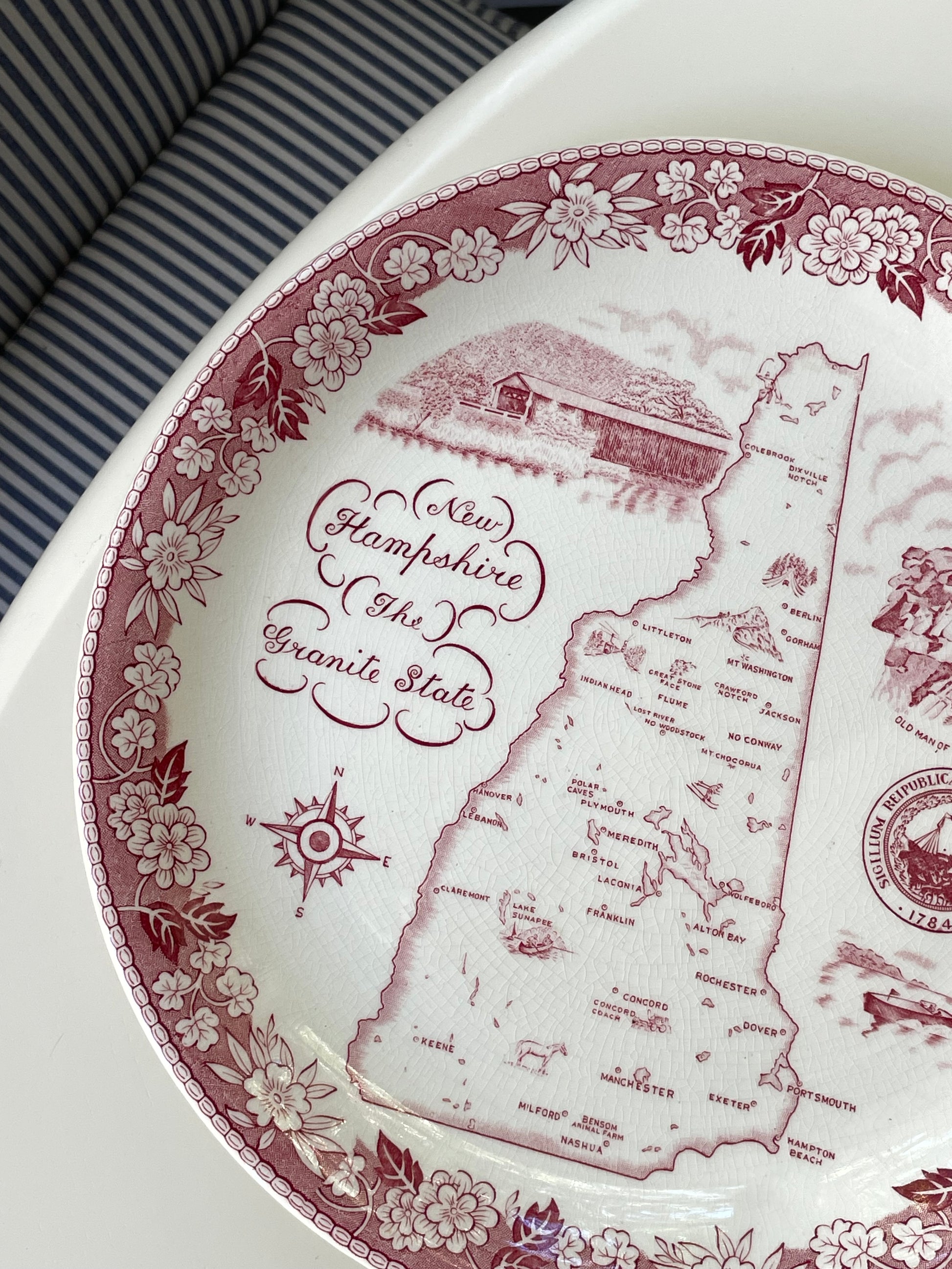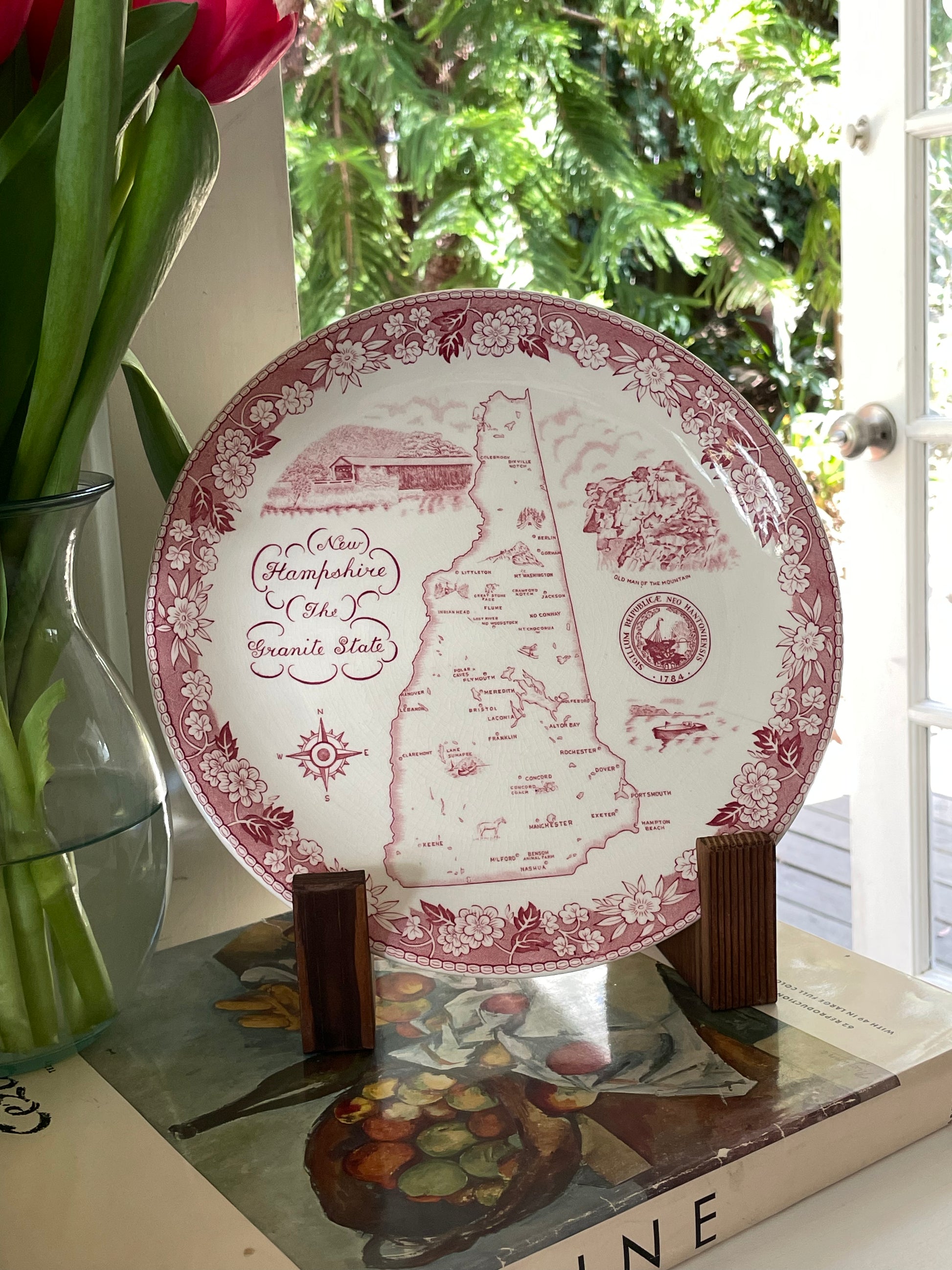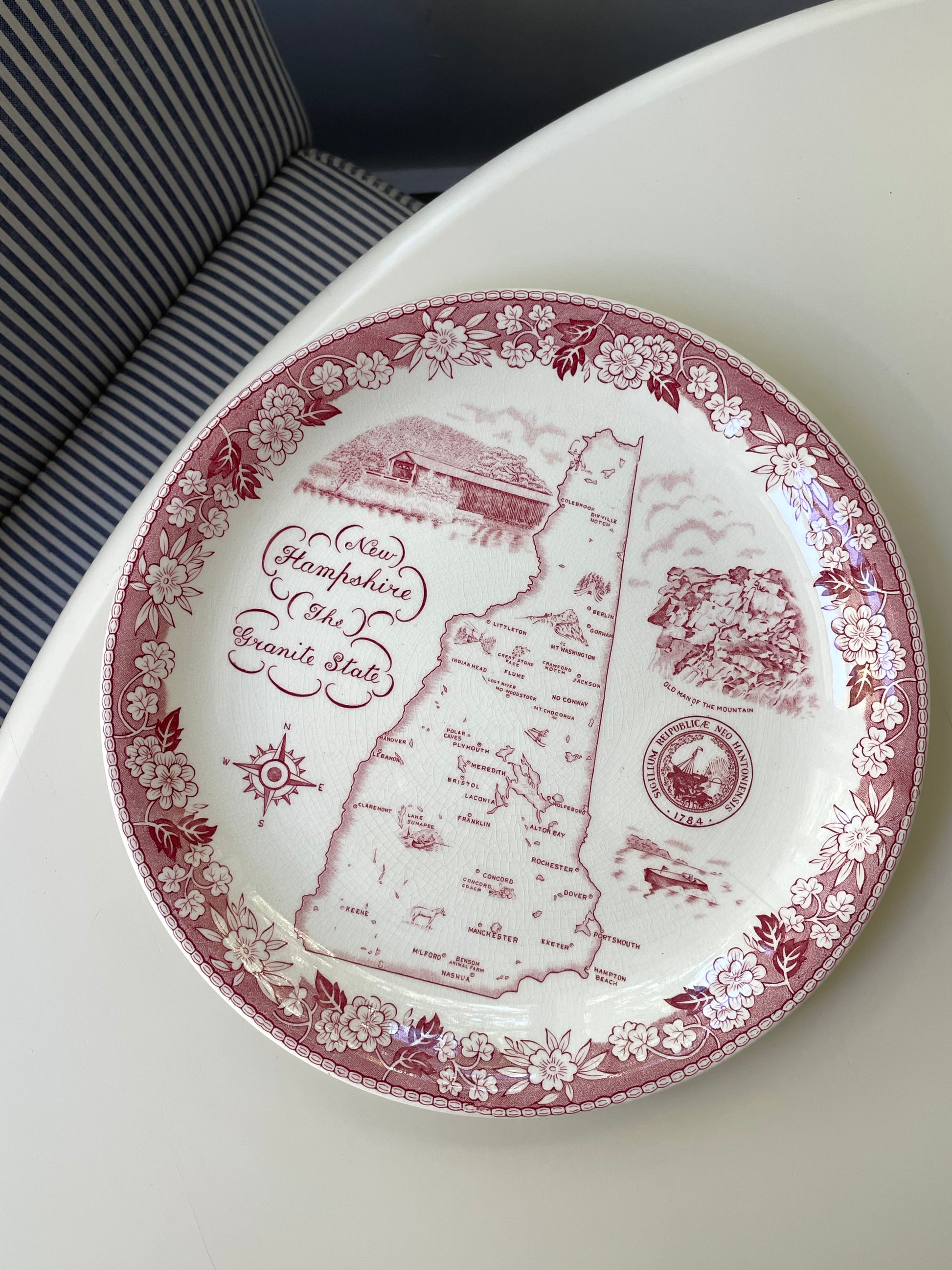 Vintage British Anchor porcelain plate featuring a map of New Hampshire. Made in England, this charming piece is perfect for collectors or as a unique display accent.
