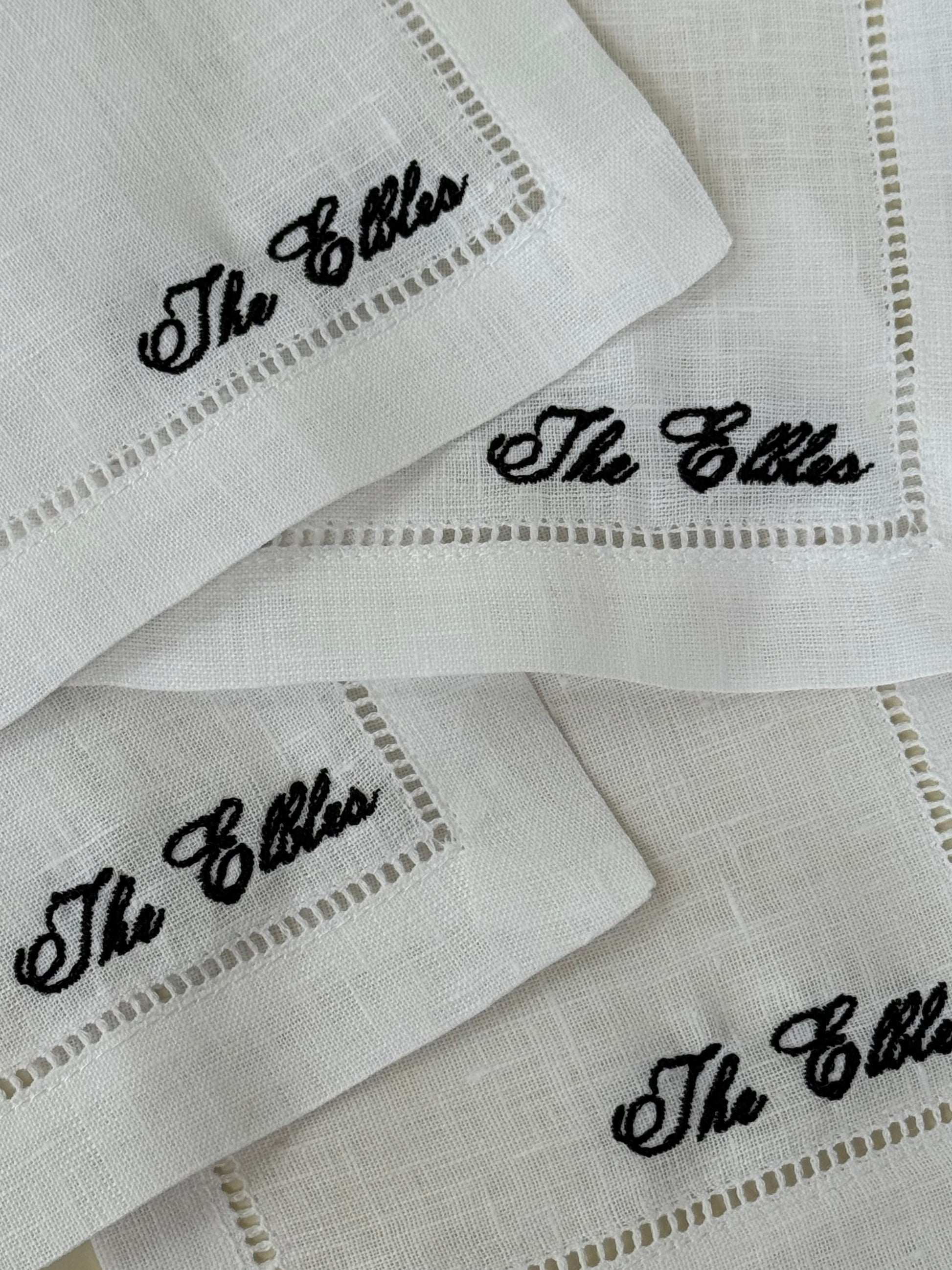 This personalized hemstitch cocktail napkin brings timeless elegance to any gathering. Featuring a delicate hemstitch border and custom embroidery, it’s the perfect finishing touch for special events, celebrations, or thoughtful gifting.