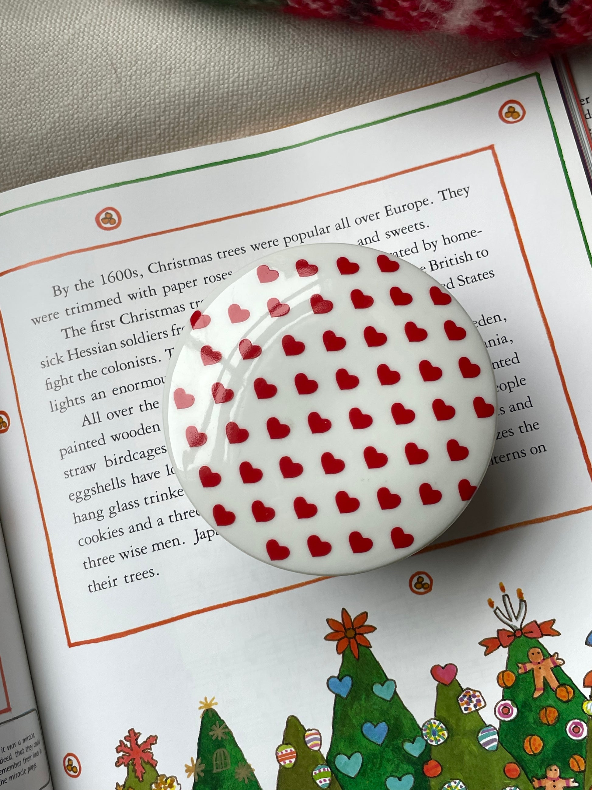 A sweet white ceramic trinket box dotted with red hearts! Perfect for keepsakes, jewelry, or little treasures.