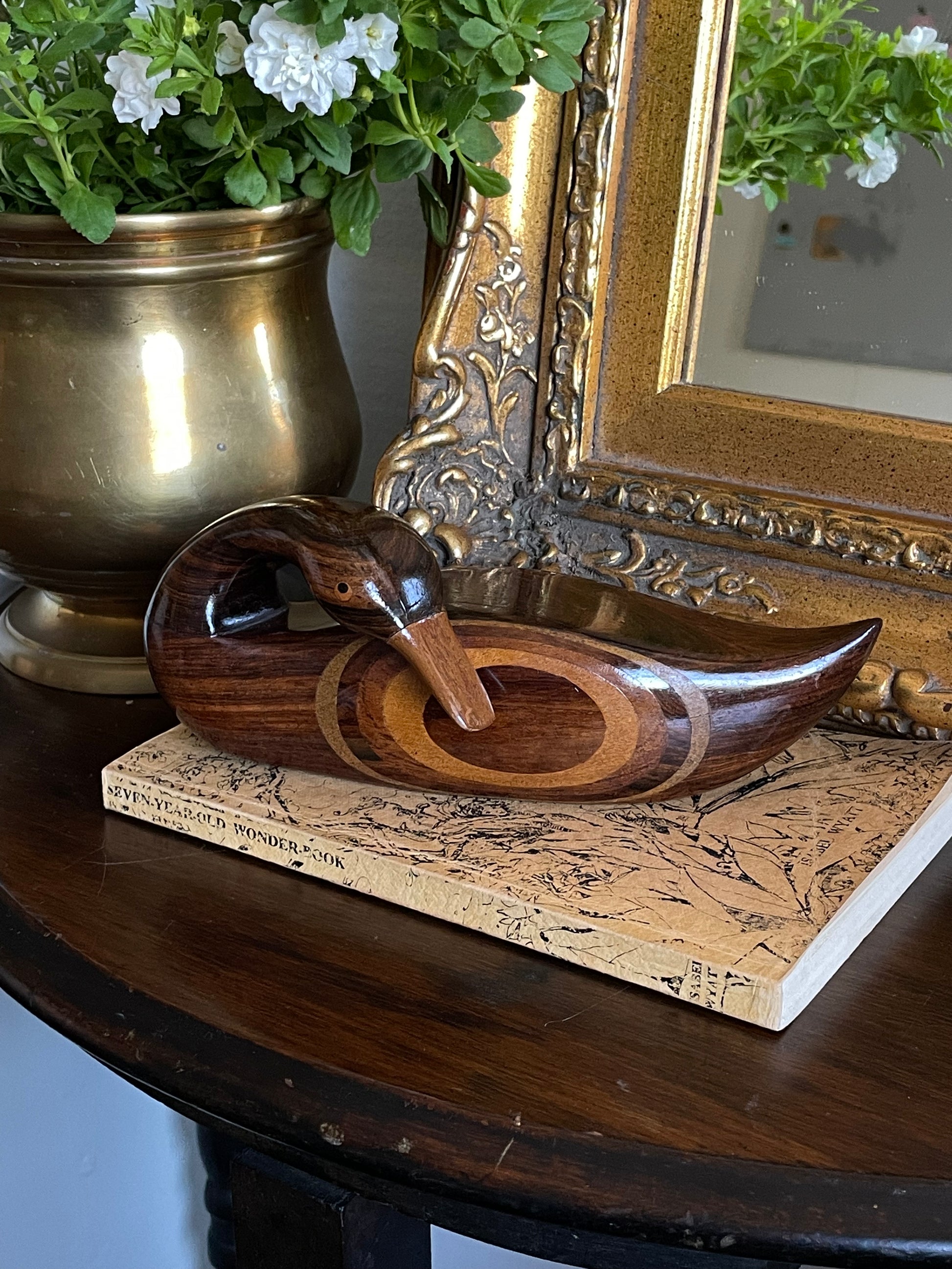 Charming wooden duck decor, expertly carved and finished to highlight its natural grain. This timeless piece brings a touch of charm to any shelf, mantel, or tabletop. Perfect for layering in a cozy, heritage-inspired space.