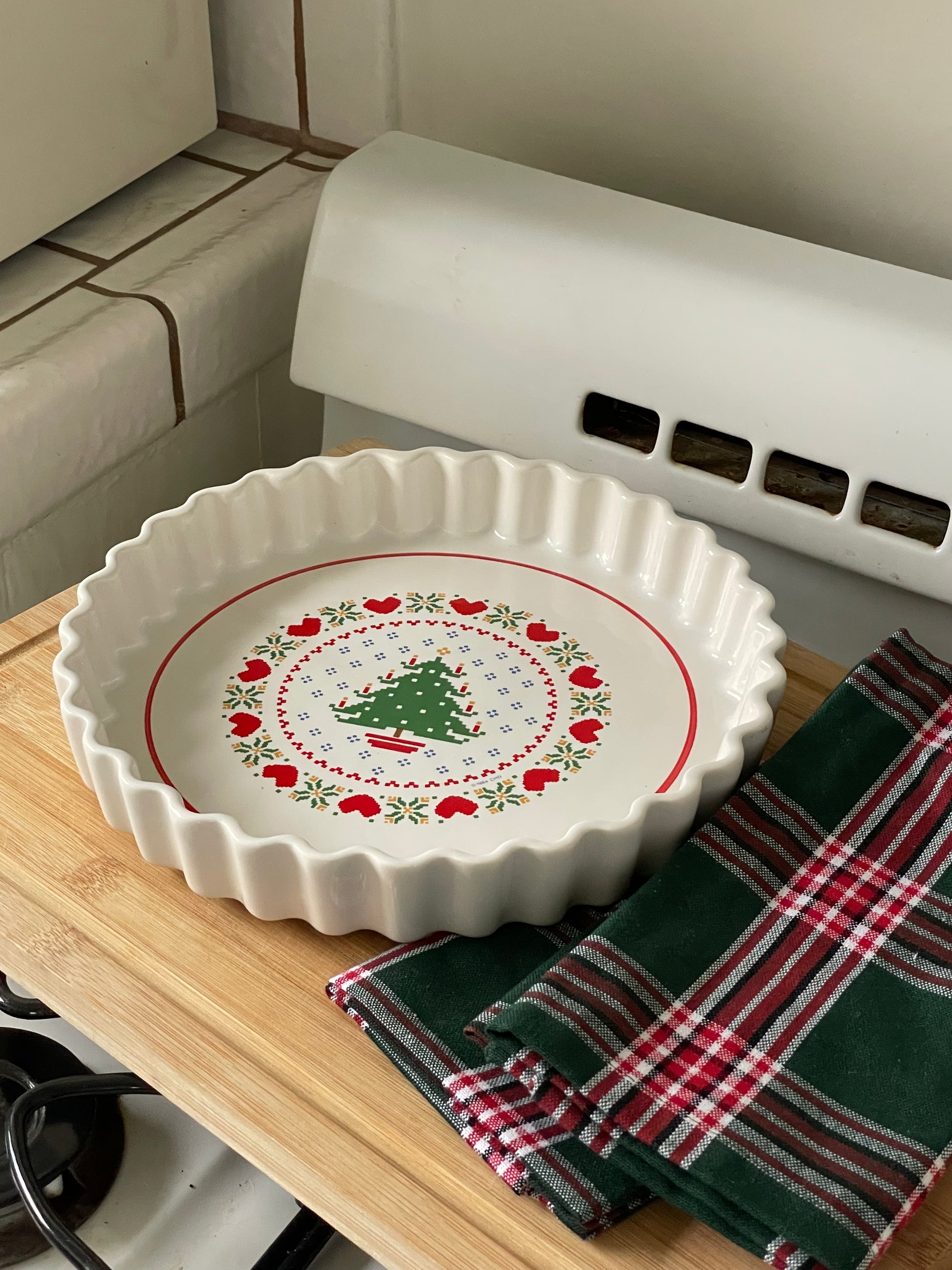 A charming find from 1984, this vintage quiche dish features a needlepoint-style Christmas tree at its center. Both nostalgic and practical, it brings a touch of handmade holiday warmth to your baking and table display.