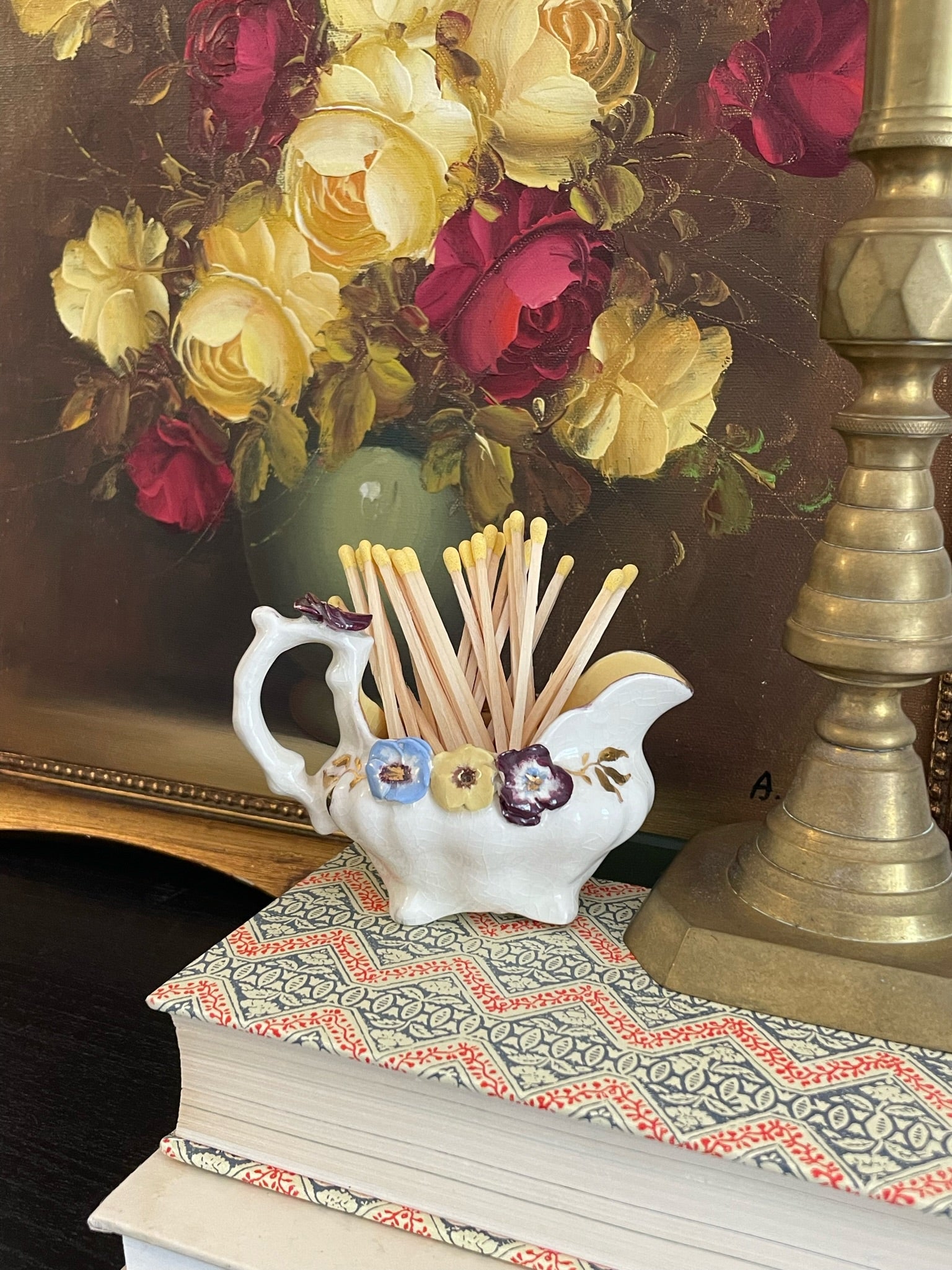 This little cutie is over 100 years old! Features stunning hand-made, three dimensional flowers, gold details and a mustard yellow interior. Store your matches in this special antique piece.