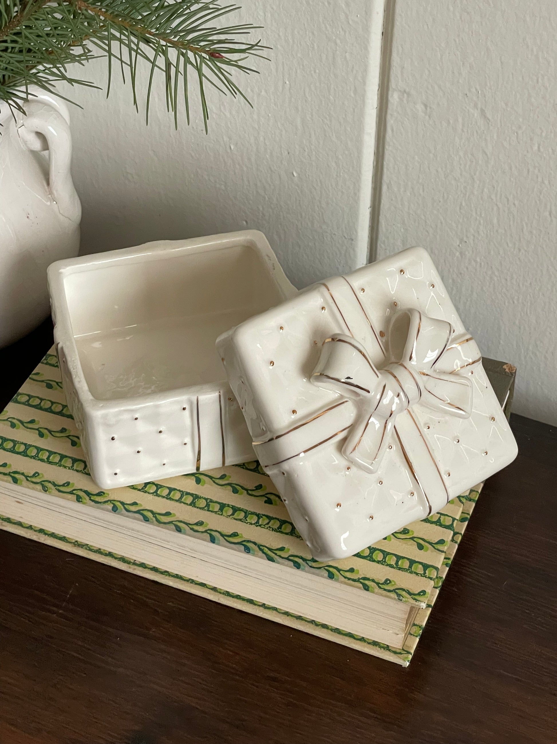 This charming white ceramic trinket box is designed to look like a wrapped gift, complete with delicate gold trim and playful gold polka dots. Perfect for storing jewelry, keepsakes, or tiny treasures, it adds a festive, elegant touch to any dresser, vanity, or holiday display.