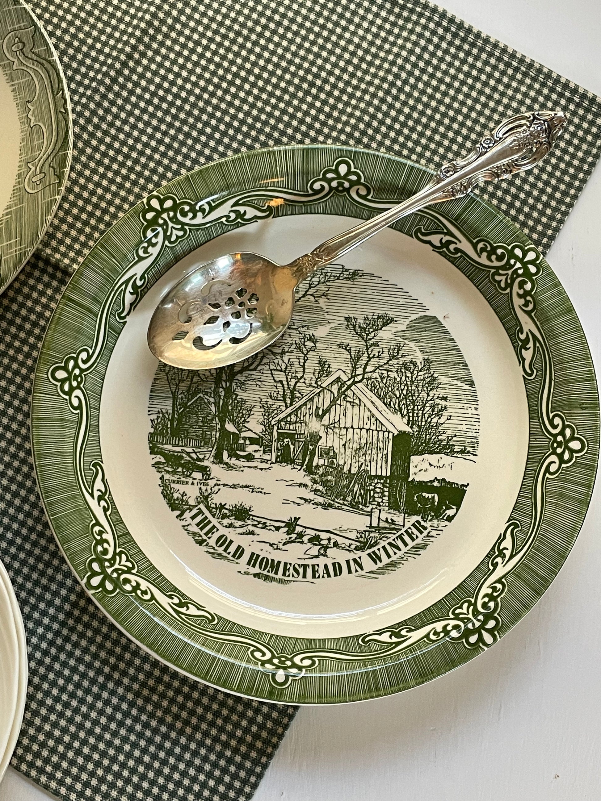 This Winter Homestead Serving Bowl adds a charming touch to your winter tablescape. The green and white bowl features a cozy cabin nestled in the snow, bringing a sense of warmth and cheer. Happy hosting!