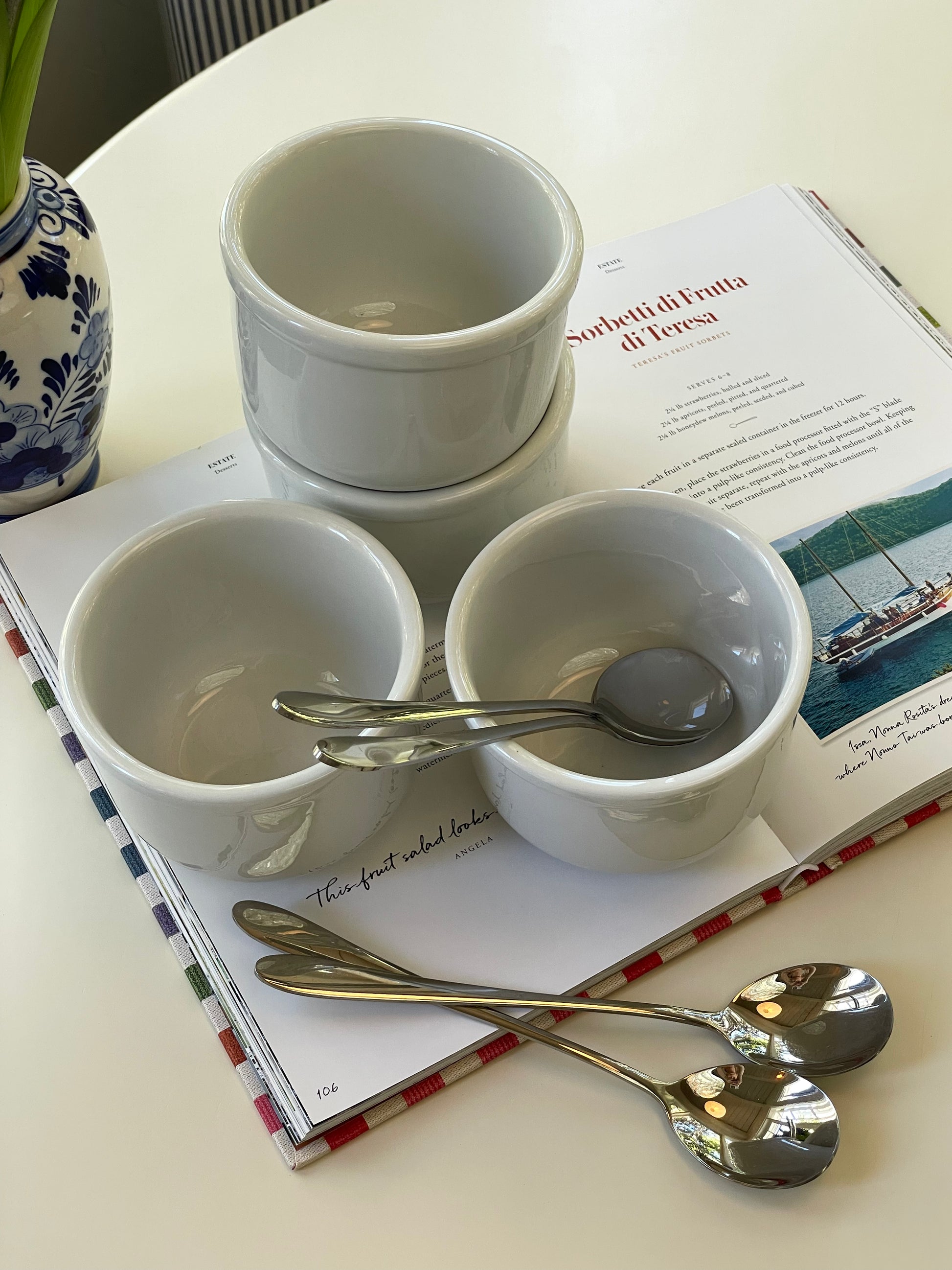 Set of 4 white bowls by Culinary Arts Porcelain. Classic, versatile, and perfect for everyday use or special meals.