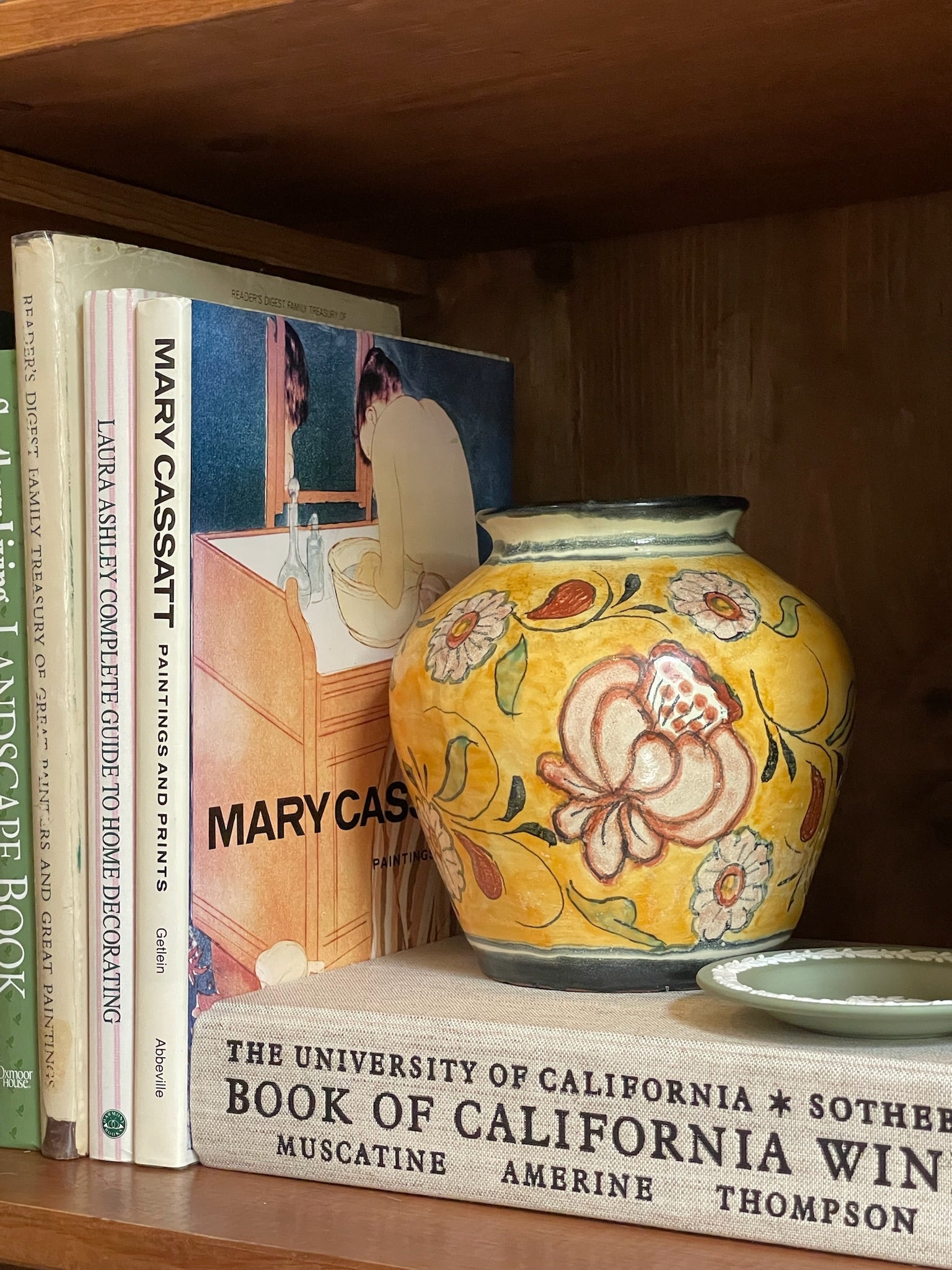 Hand-painted pottery vase with a bright happy yellow background and beautiful pink flowers.