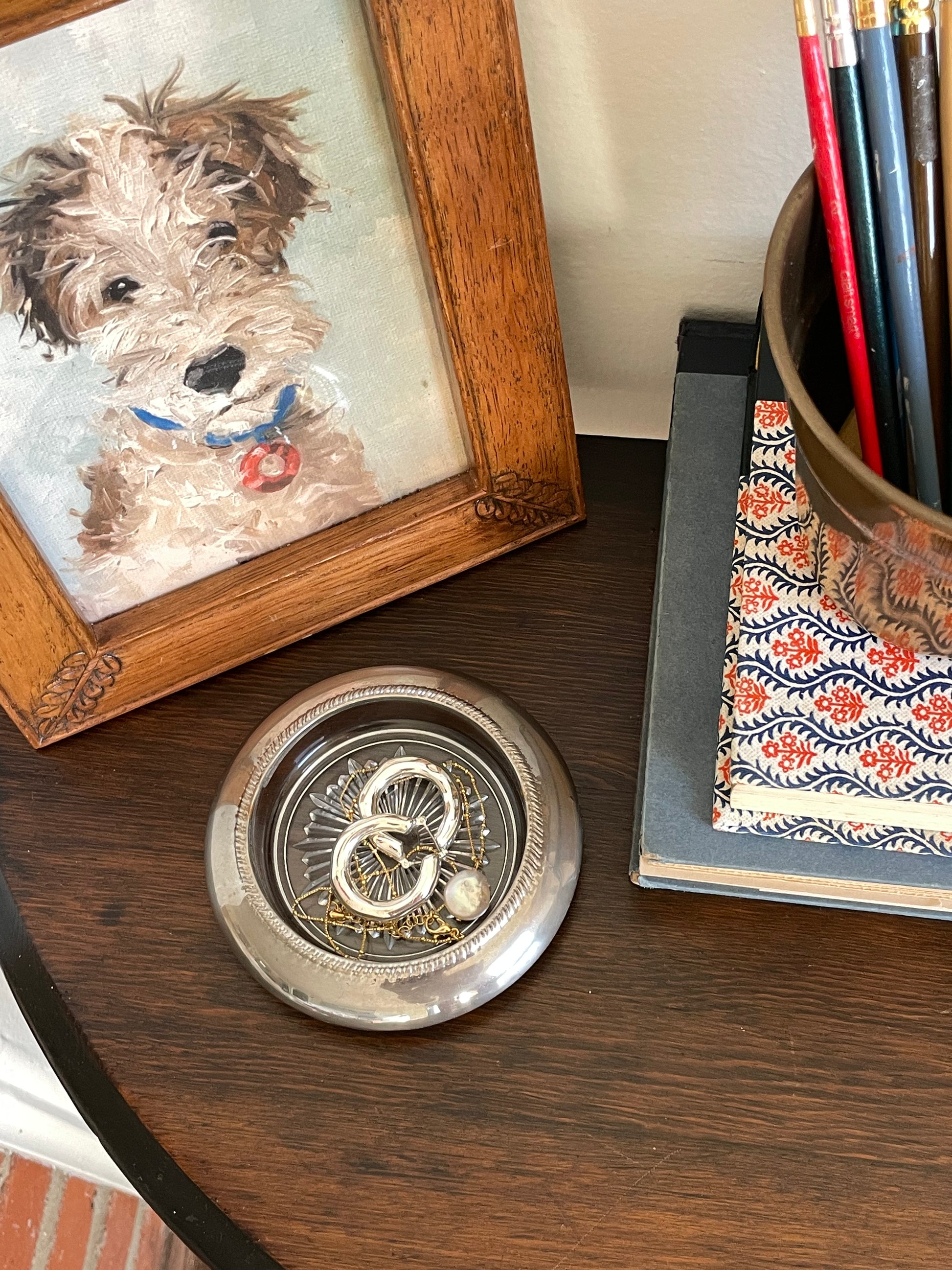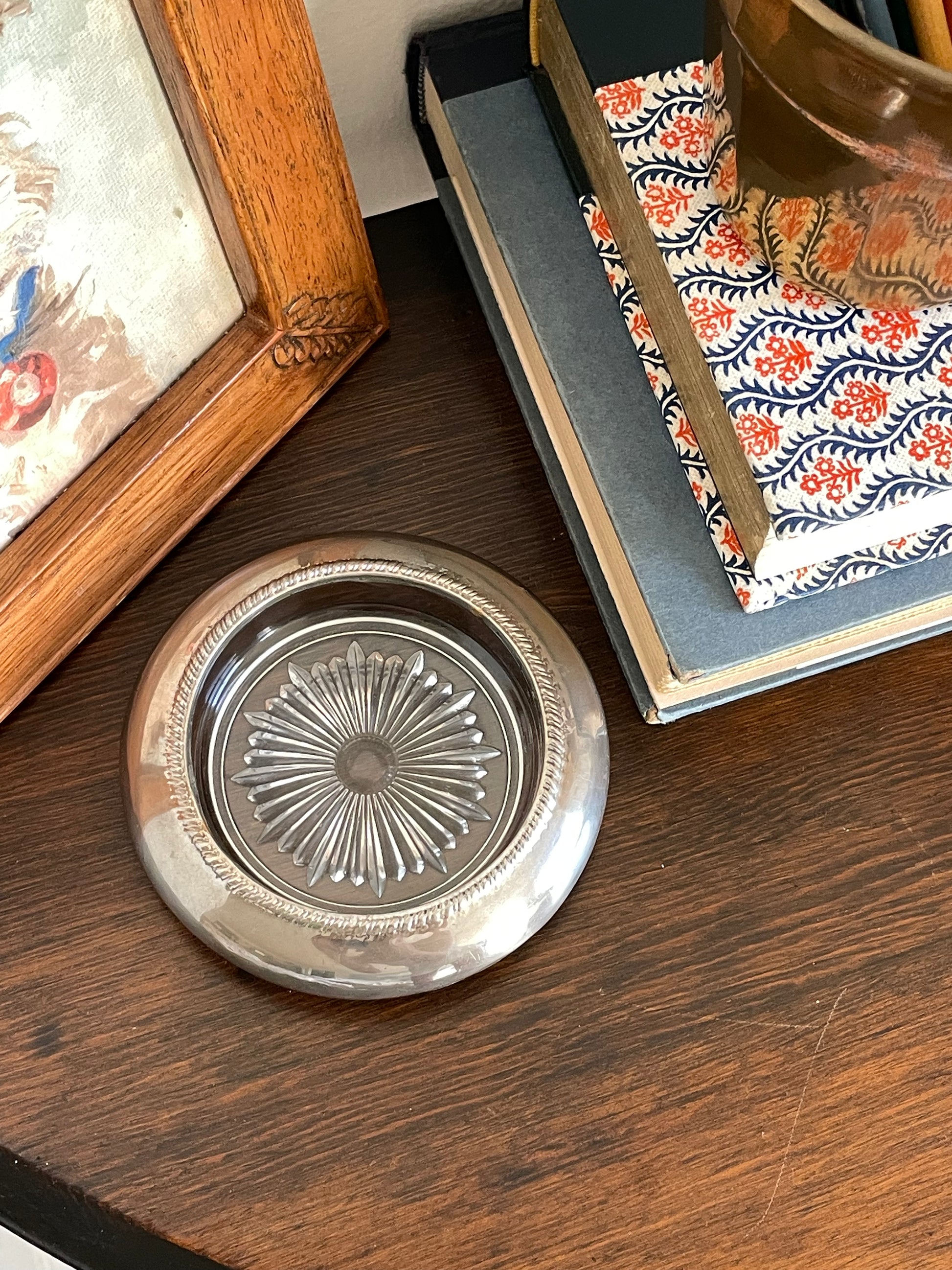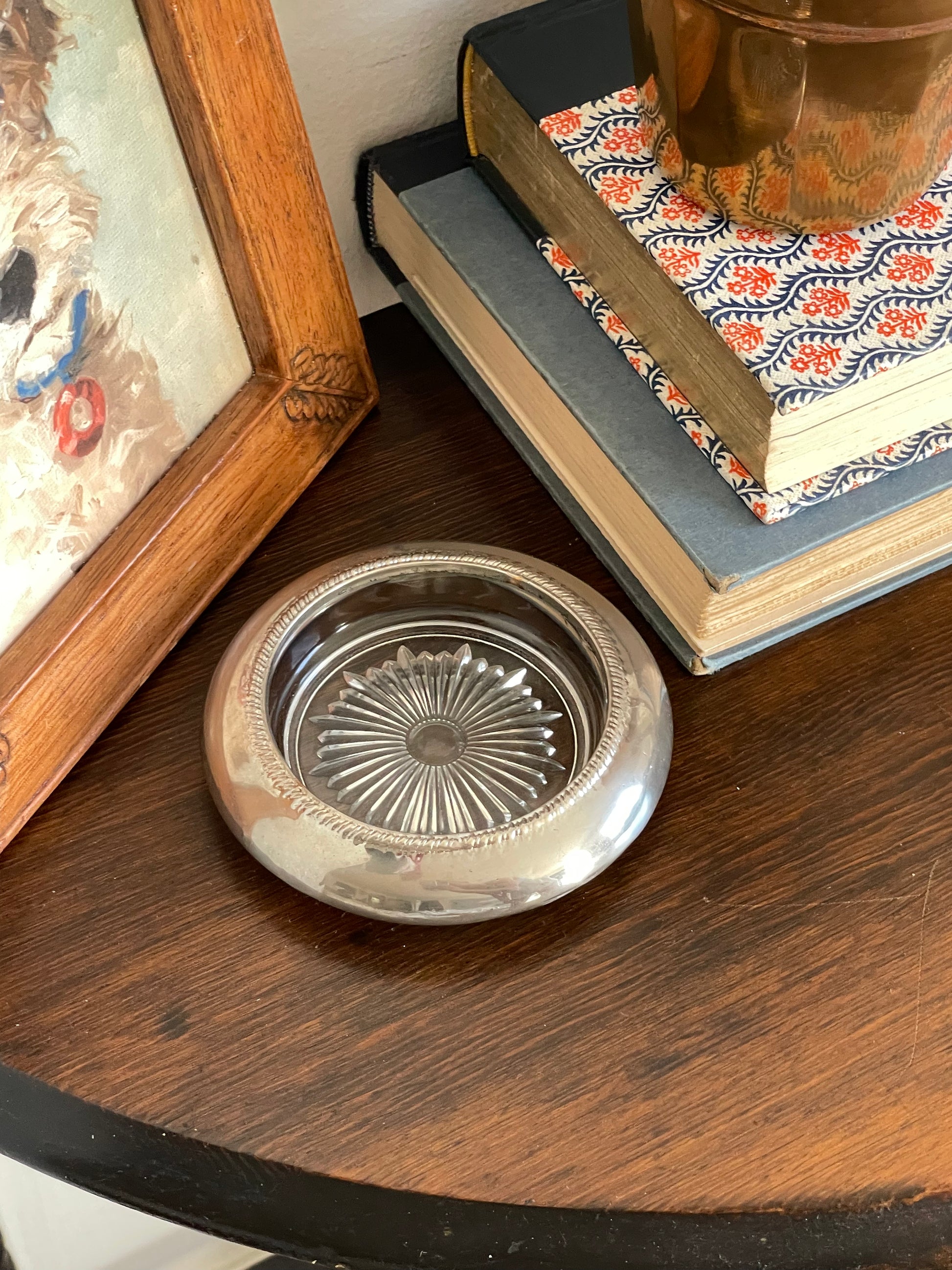 A very special glass trinket dish with a metal rim. For your most special jewelry or trinkets!