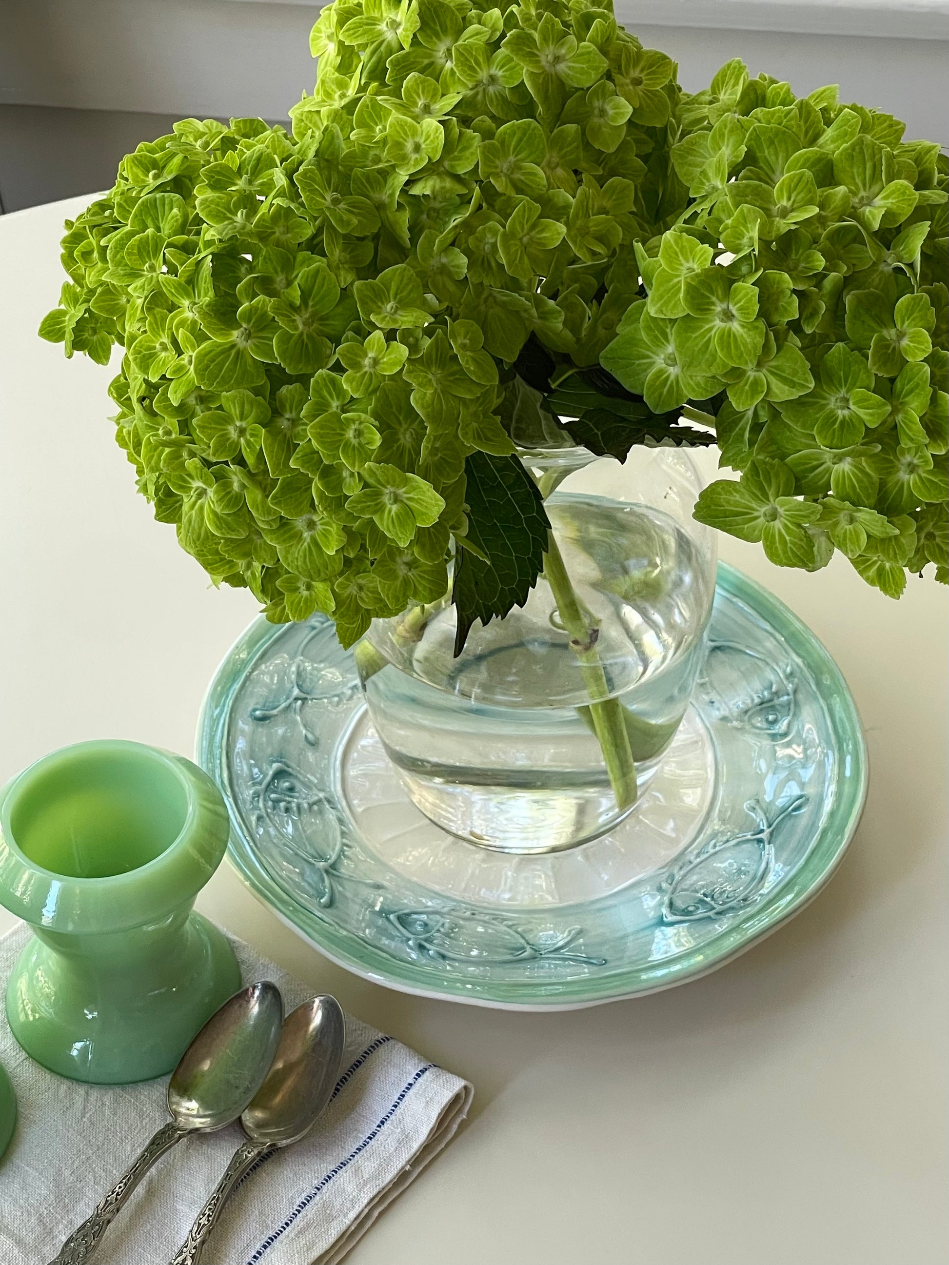 Teal, green, and blue plate with fish swimming around the rim. A cheerful, whimsical piece that brings a splash of color and coastal charm to any table. Made in Italy.