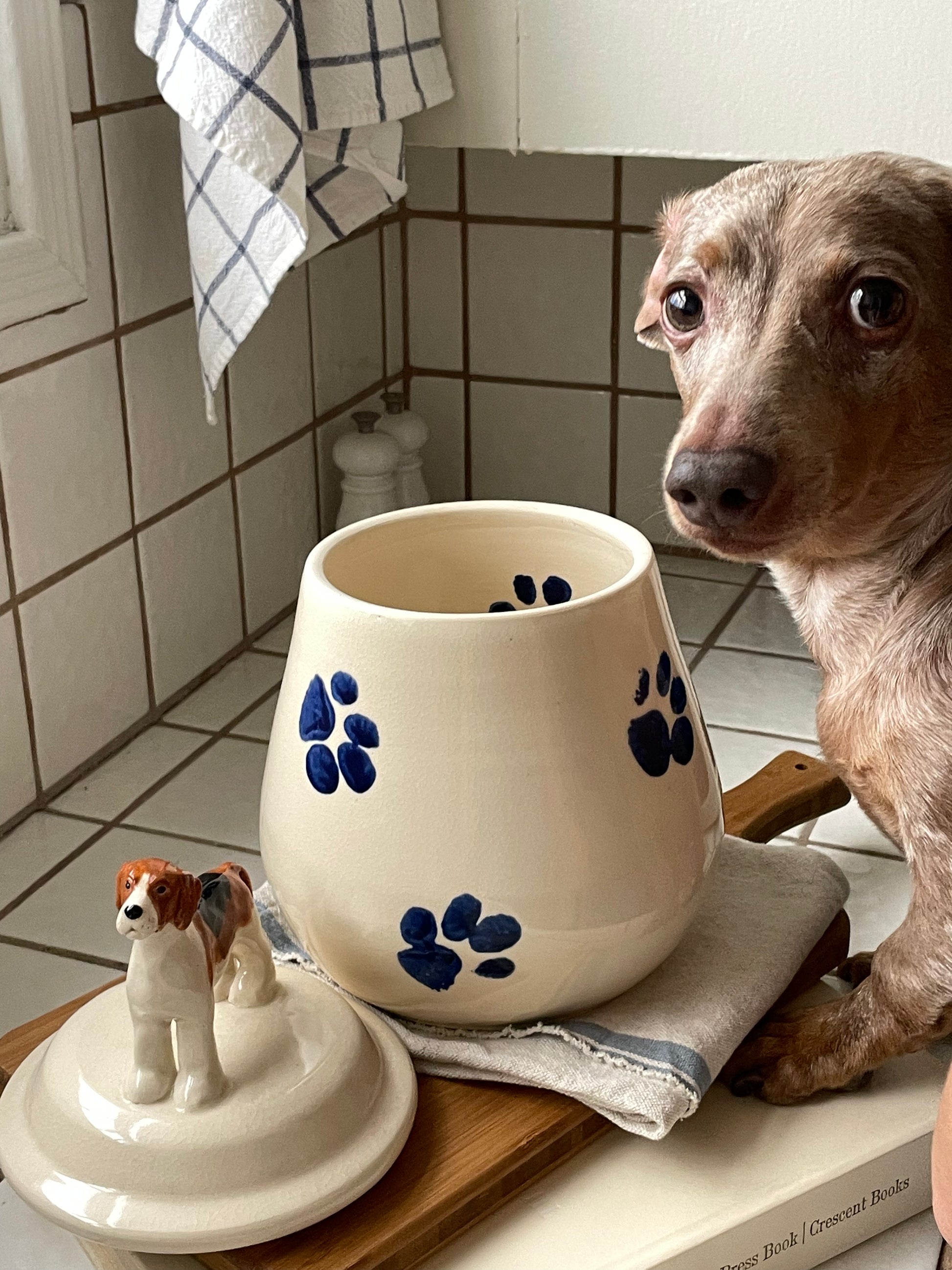 A delightful ceramic dog treat jar, decorated with playful blue paw prints and topped with an adorable dog figurine. Perfect for storing treats while adding a charming, whimsical touch to your kitchen or pet corner!