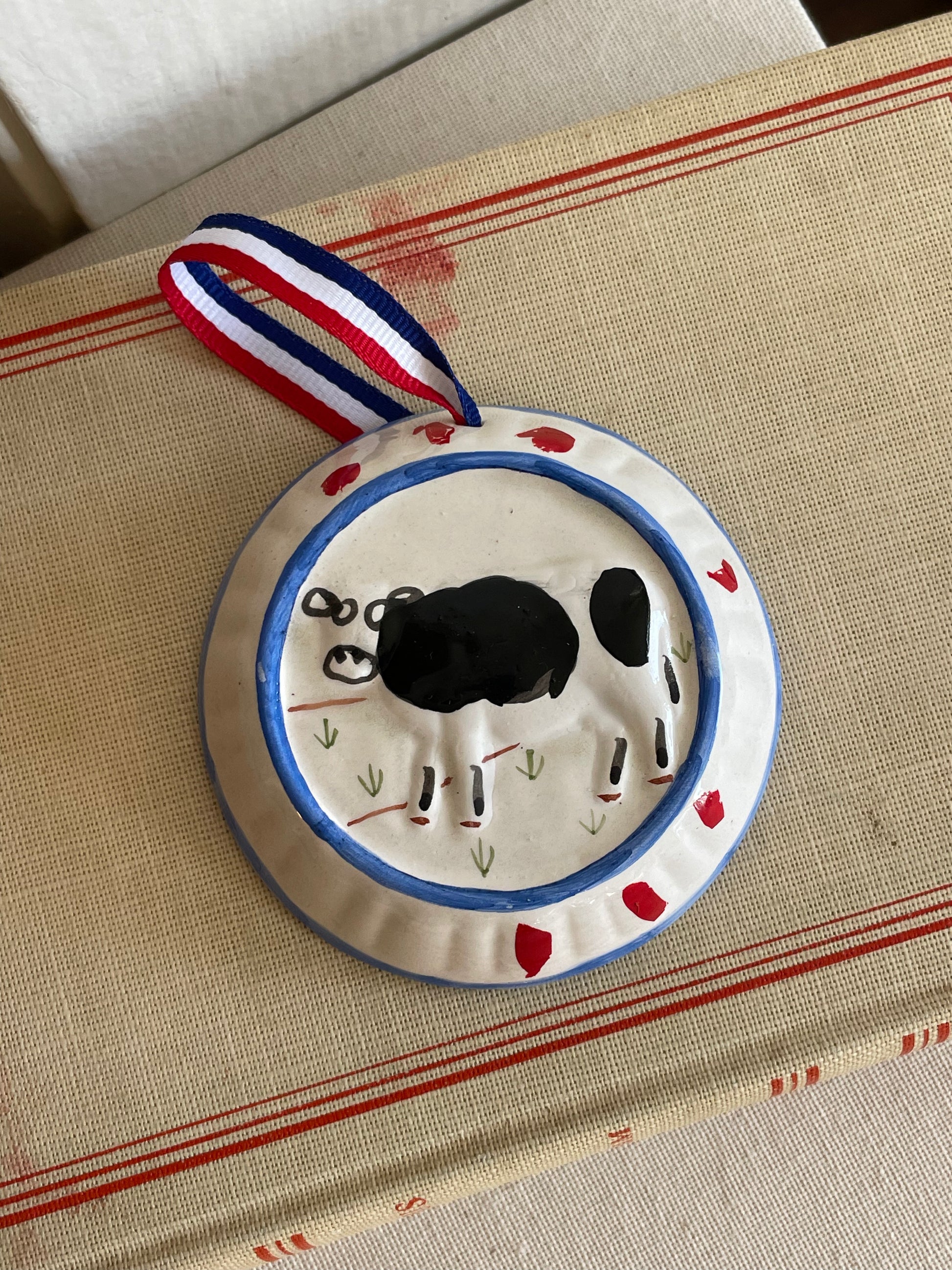 A small, charming hand-painted, kitchen-mold featuring a painted cow that brings an adorable, country-style warmth to your space.
