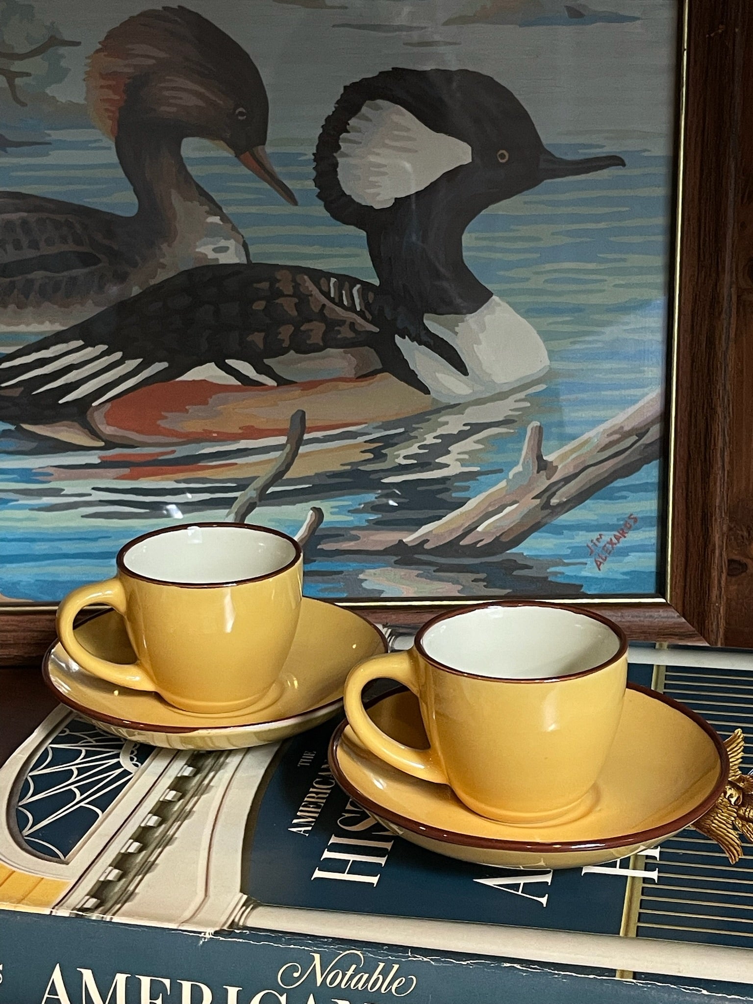 Brighten your coffee moments with the Honeybee Espresso Cups. These cheerful yellow cups, each accented with a rich chocolate brown rim, add a playful pop of color to your morning coffee routine.
