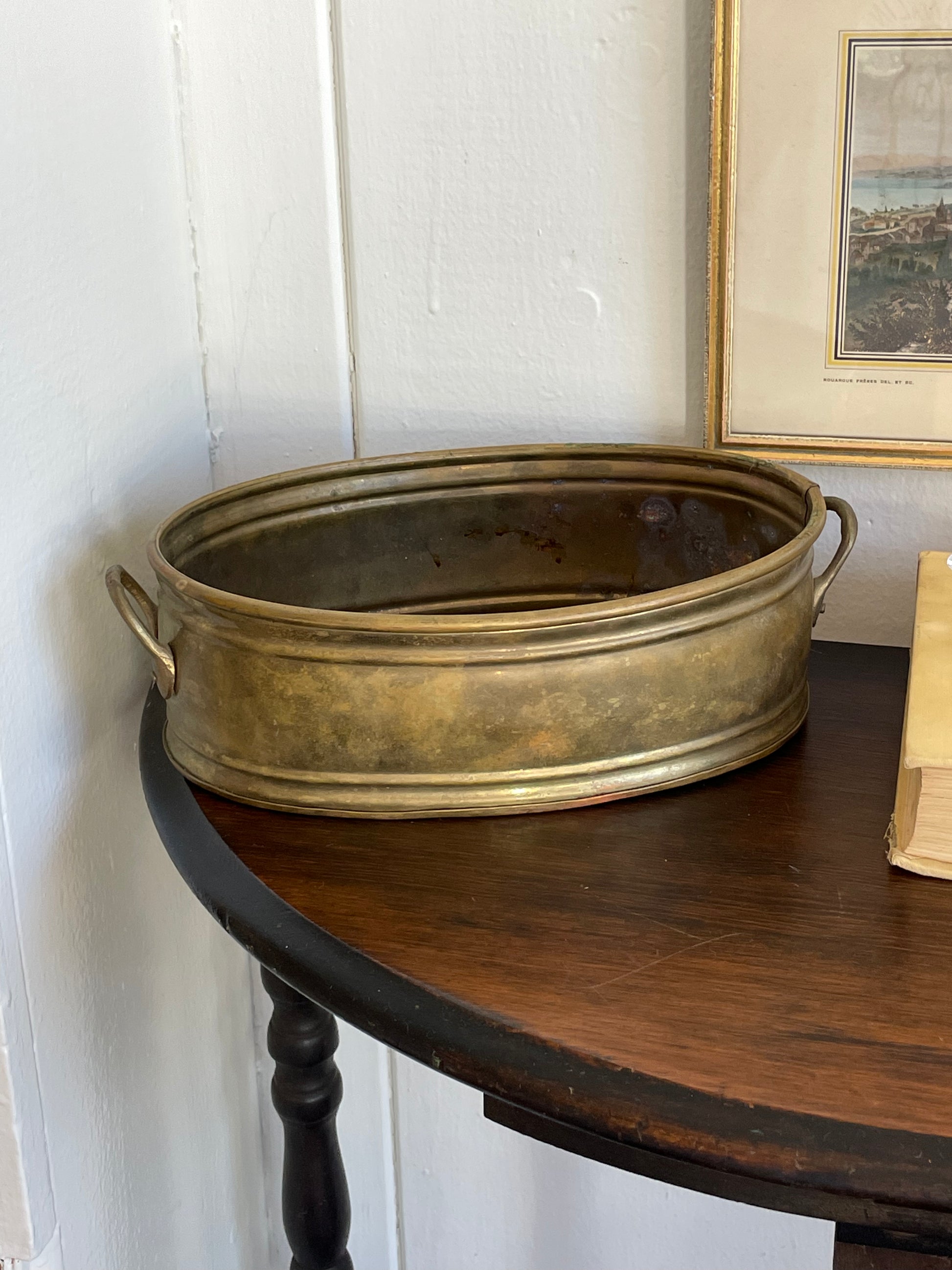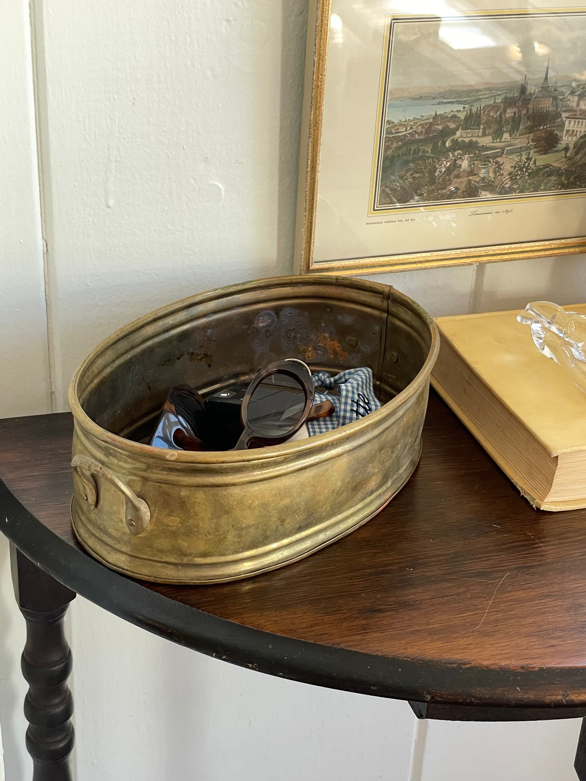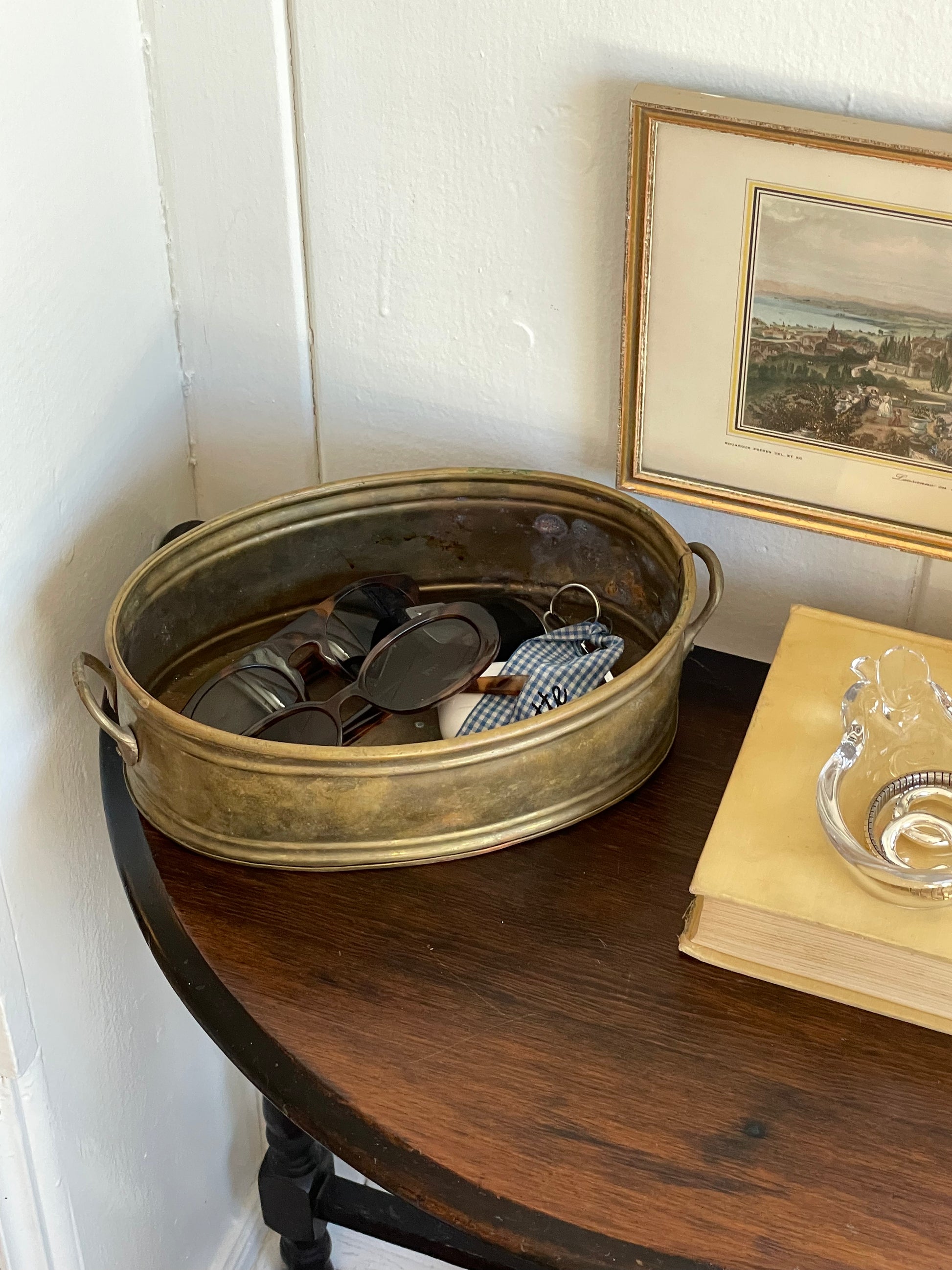 Add a touch of vintage charm to your space with the Kensington Catch-All. This oval metal dish features two handy side handles and a rustic brass finish with a lovable tarnish. Perfect for corralling keys, jewelry, or those little everyday treasures, it brings organization with lots of character.