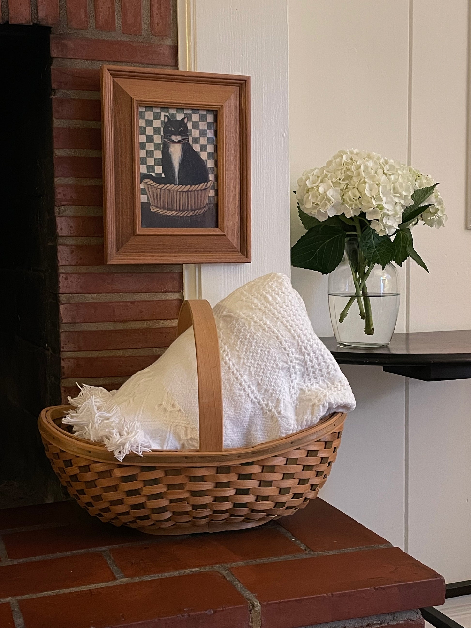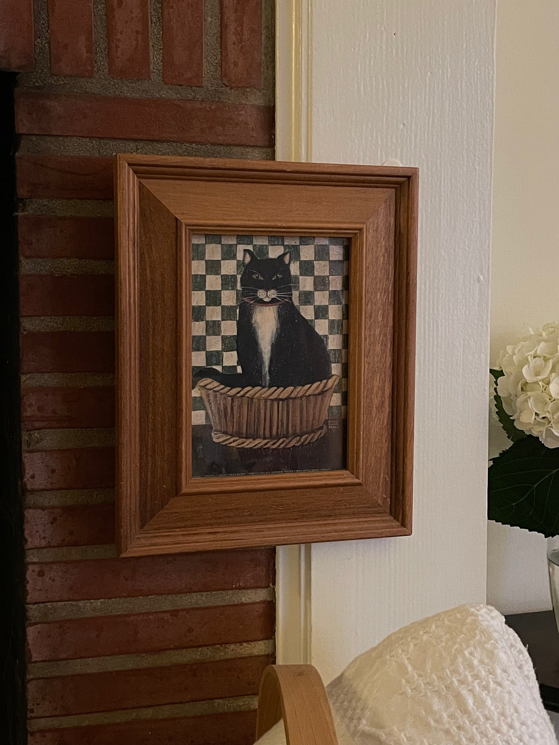 The Percy Framed Art features a charming cat nestled in a basket, set against a classic checkered backdrop and encased in a finely crafted wooden frame. This piece blends warm natural textures with timeless design, adding an elegant yet cozy touch to any living space. Perfect for you or the cat-lover in your life! Art Print by David Carter Brown.