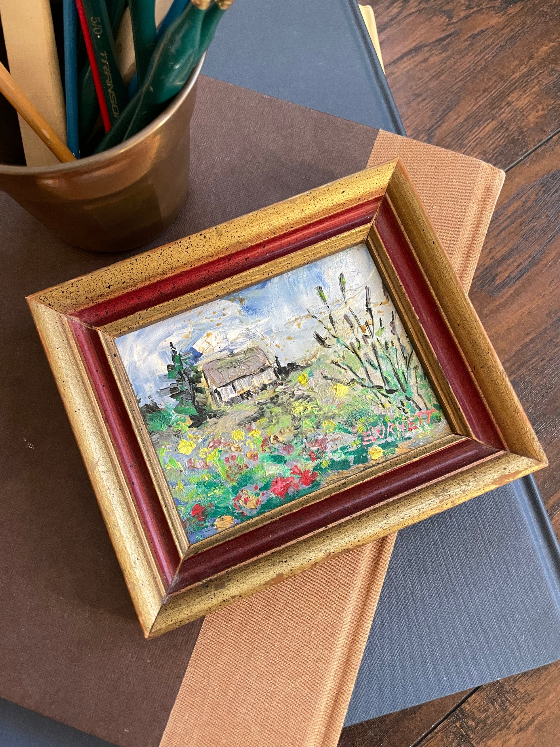 The Rosewood Cottage Framed Painting showcases a charming garden cottage captured in delicate brushstrokes, enclosed within a luxurious gold frame accented with rich red detailing. This cozy piece adds timeless elegance and a warm, inviting atmosphere to your living space!