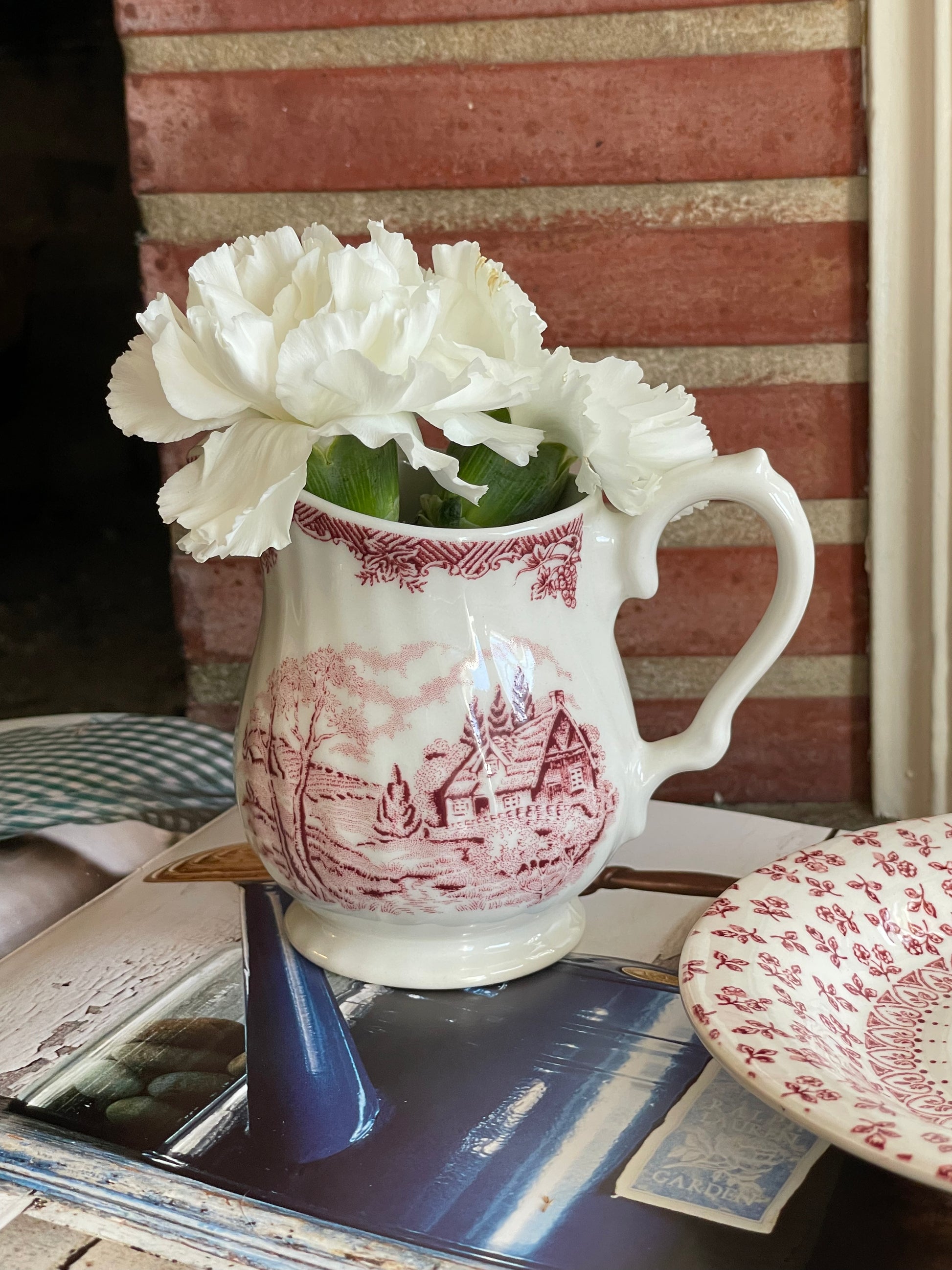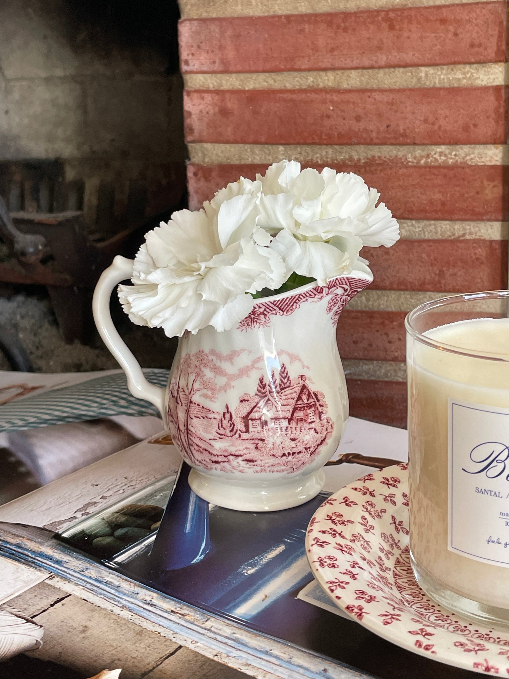 This white ceramic mini pitcher features a delicate red design, showcasing timeless elegance and classic style. Perfect for adding a touch of vintage charm to your collection.
