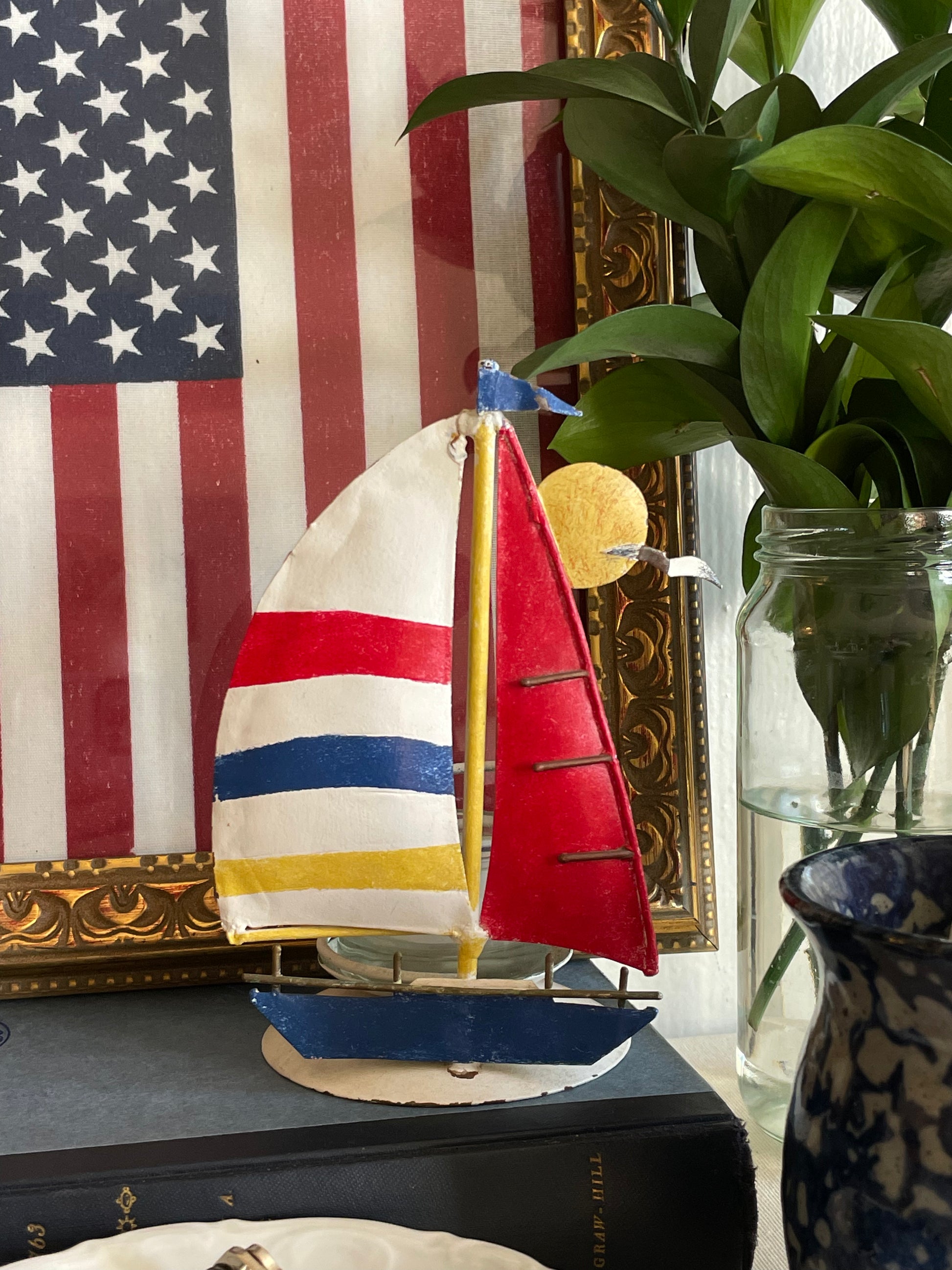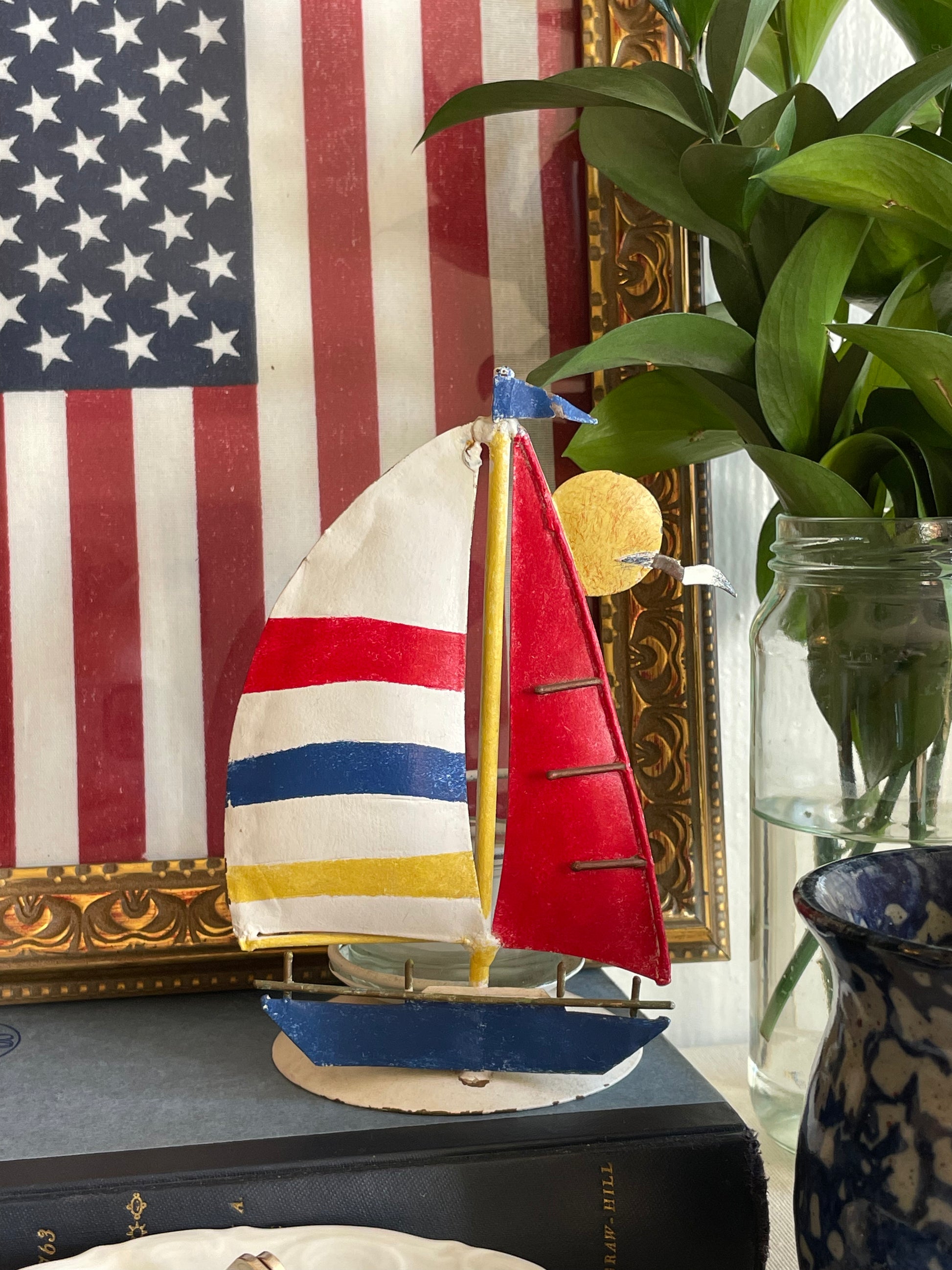 Brighten your space with this charming metal sailboat featuring vibrant red, white, blue, and yellow sails. Perfect for adding nautical flair and cozy ambiance!