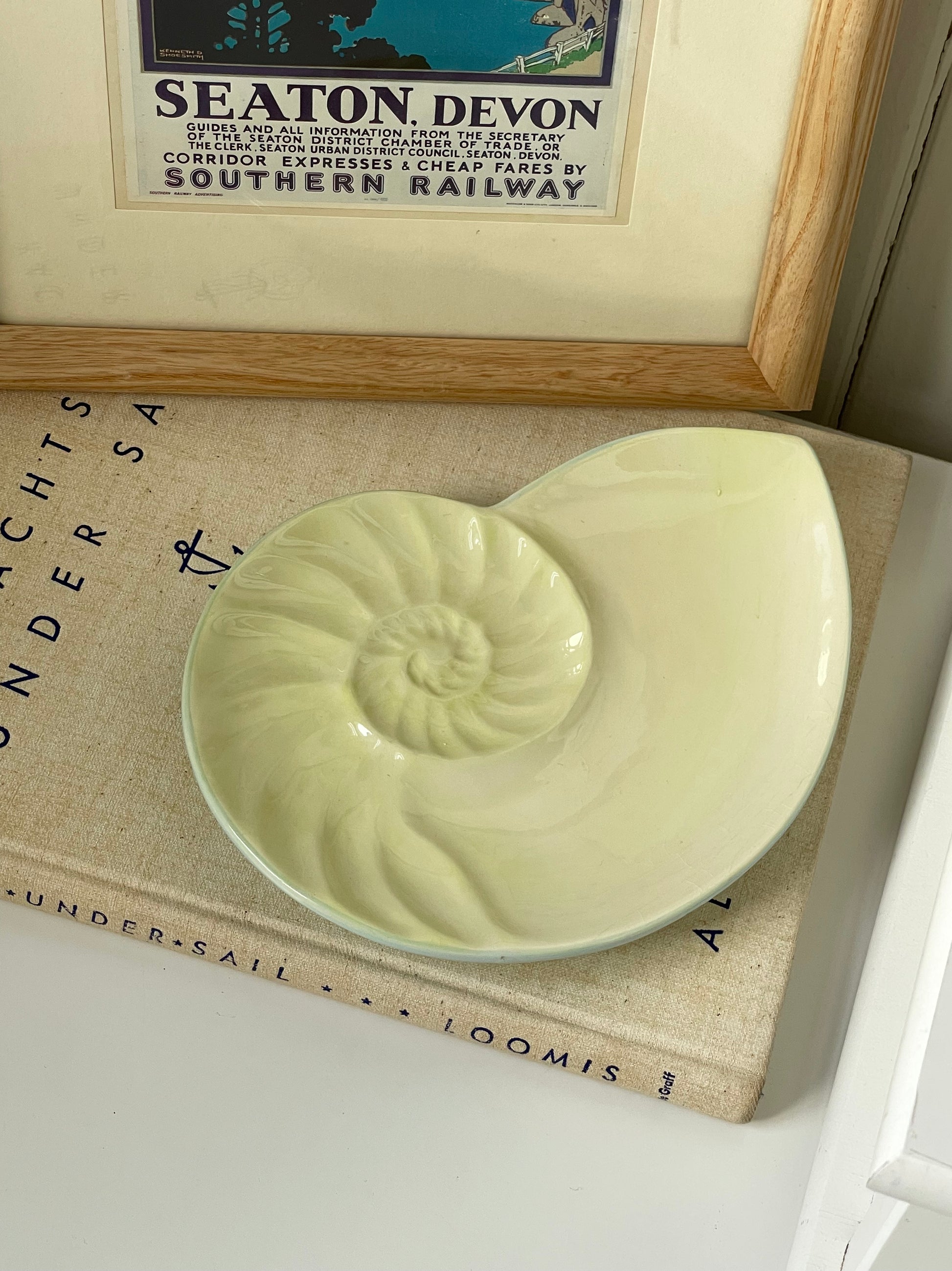 A light green nautilus shell-shaped trinket plate with a soft seafoam hue. Perfect for jewelry, matches, or small keepsakes. An easy coastal accent for bedside tables or layered vignettes. By Global Design Connections by Kate Williams.