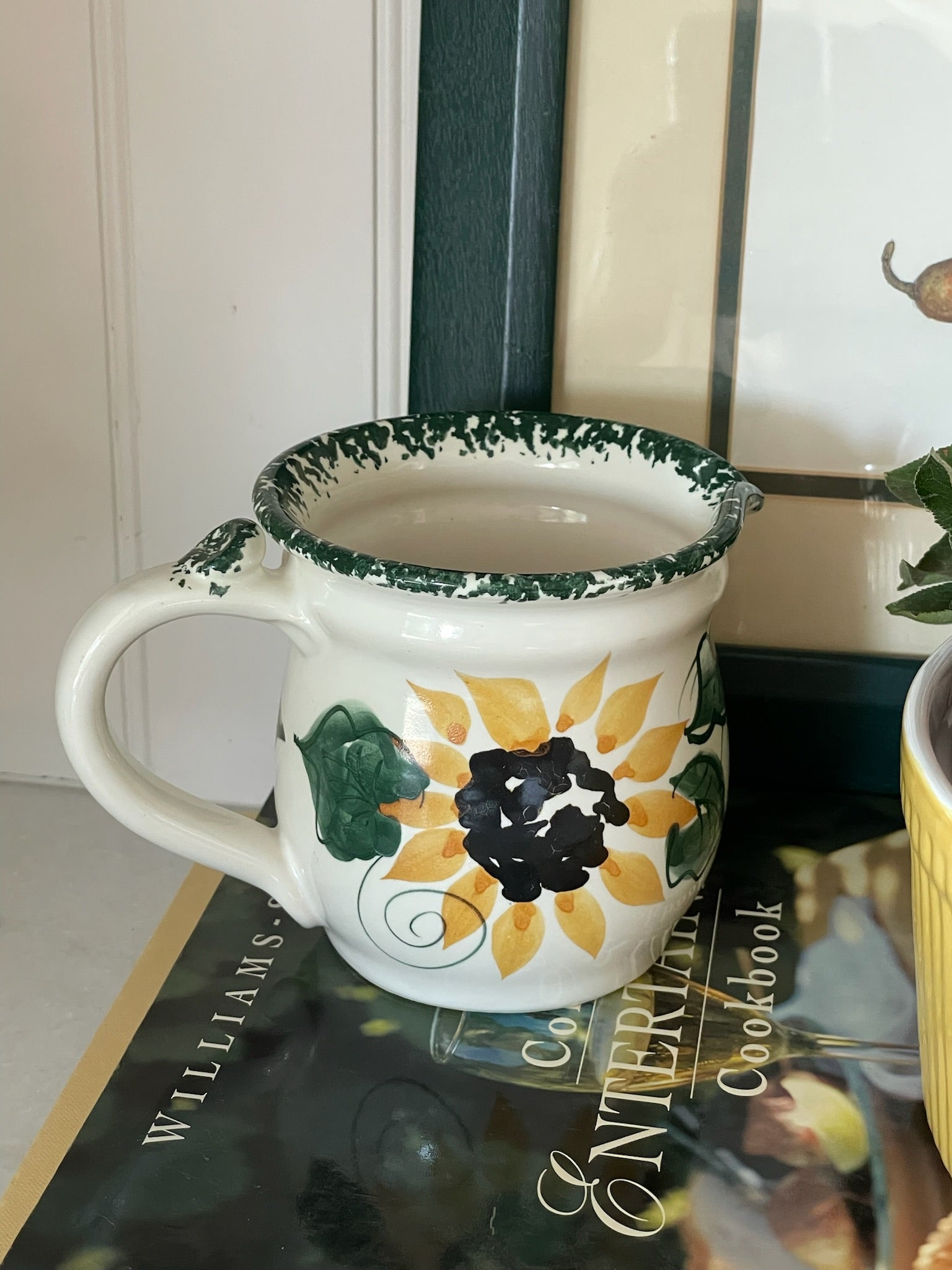 An adorable mini pitcher with a sponge-painted rim and hand-painted sunflowers. Handmade and hand-painted fine stoneware by The Ashland Pottery Company. Made in USA.